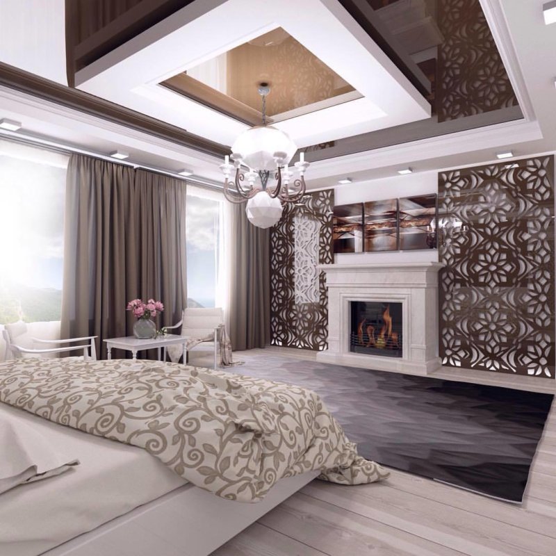 Sur des mètres carrés impressionnants, vous pouvez créer un design unique avec des accents lumineux et une mise en page parfaite. Il y a suffisamment d'espace pour une cheminée électrique, une table basse avec des fauteuils élégants, un grand lit au design chic, une armoire spacieuse et un miroir au sol.