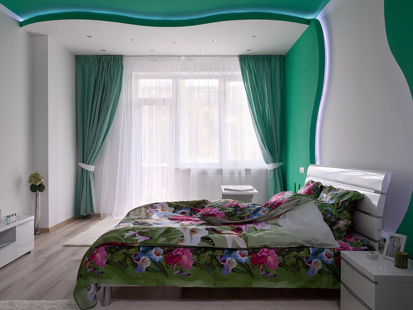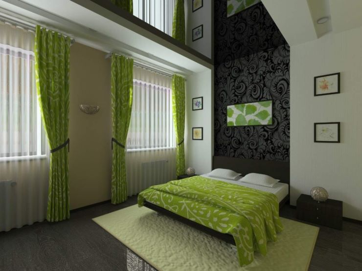 N'oubliez pas non plus les combinaisons de couleurs réussies, démontées plus tôt. Dans une pièce verte, des rideaux d'une couleur différente peuvent devenir un élément esthétique.