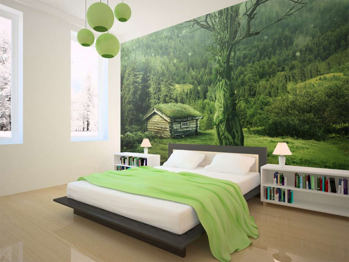 Si un mur est mis en évidence avec un grand motif, cela rendra visuellement la pièce plus large, ainsi que l'introduction harmonieuse du papier peint photo.