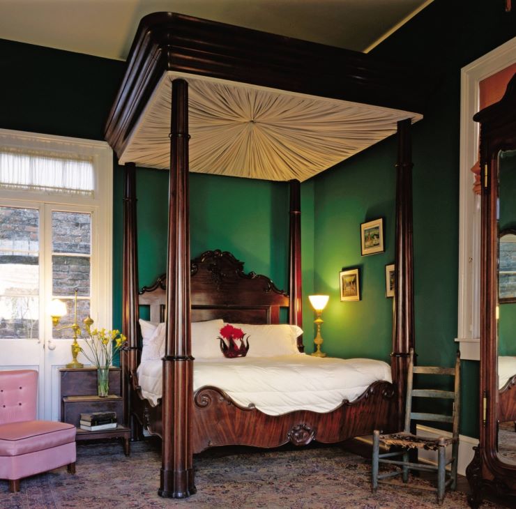 Au cœur du design classique de la chambre dans les tons verts se trouve une couleur vert fumé.