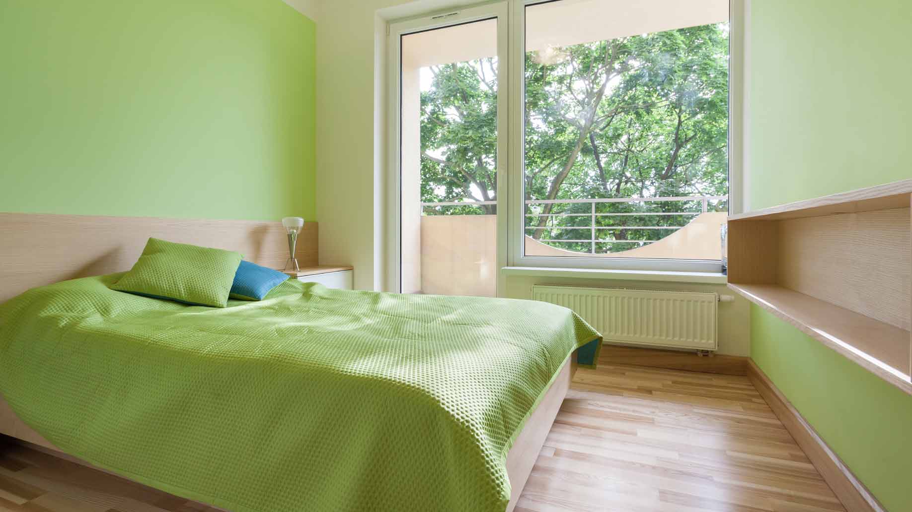 Le vert clair et le blanc neutre dans la chambre créent un sentiment de sécurité.