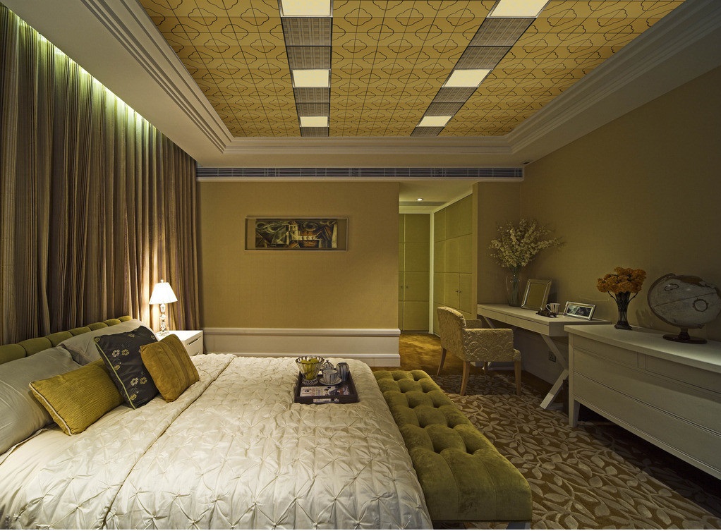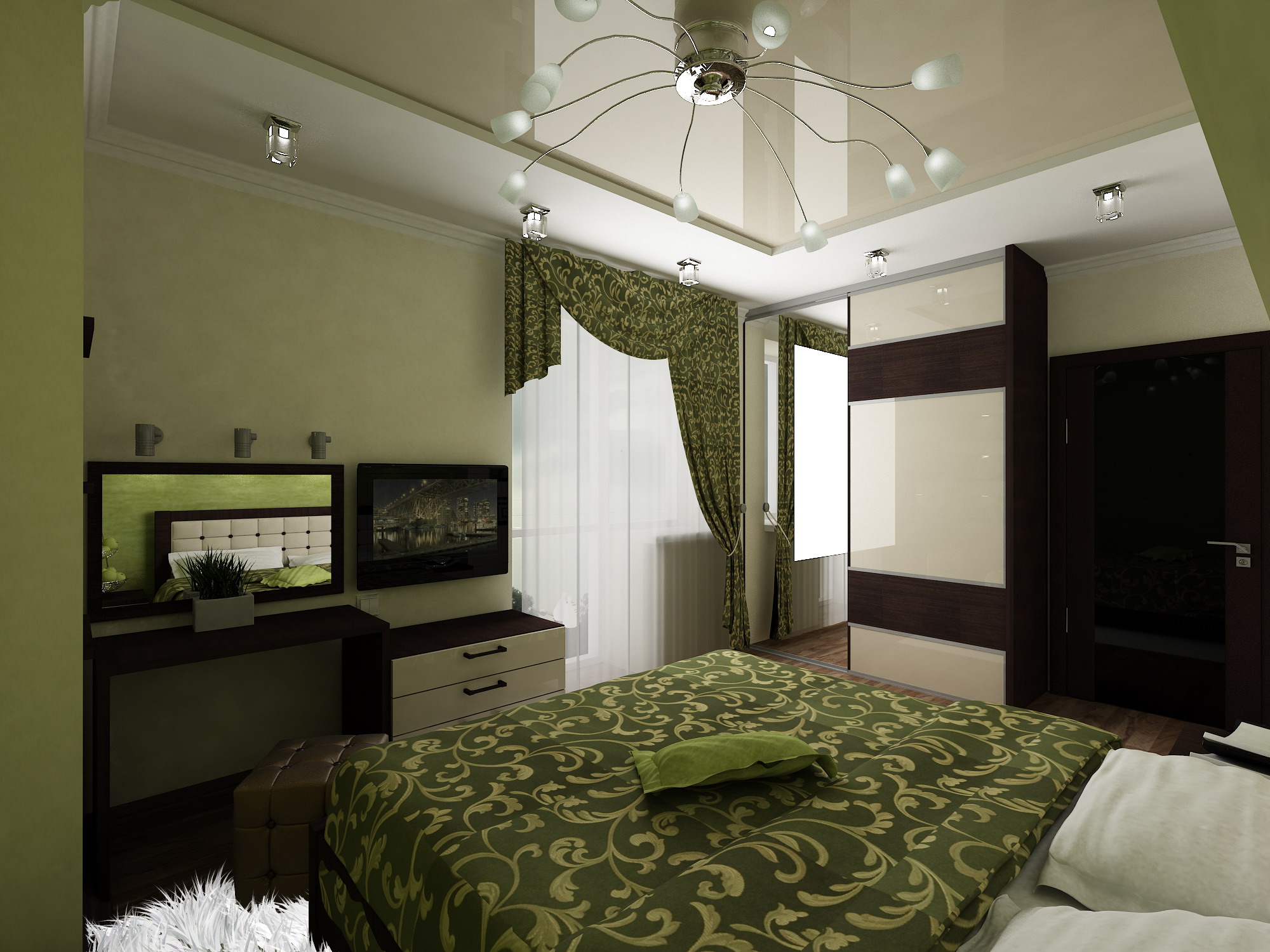 L'éclairage dans toute pièce destinée au repos doit être atténué, et dans une chambre faite de tons herbeux doublement. Une bonne solution serait d'installer un éclairage au plafond ou sous forme de lampadaire.