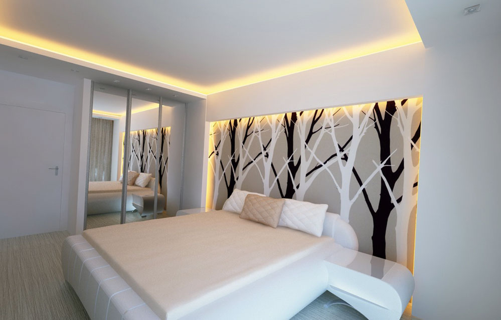 Les faux plafonds modernes avec éclairage dans la chambre vous permettent de monter des lampes de toutes formes et tailles. Ils doivent être économes en énergie et dégager de la chaleur. Vous pouvez utiliser une ampoule à incandescence, mais avec une capacité ne dépassant pas 60 watts.