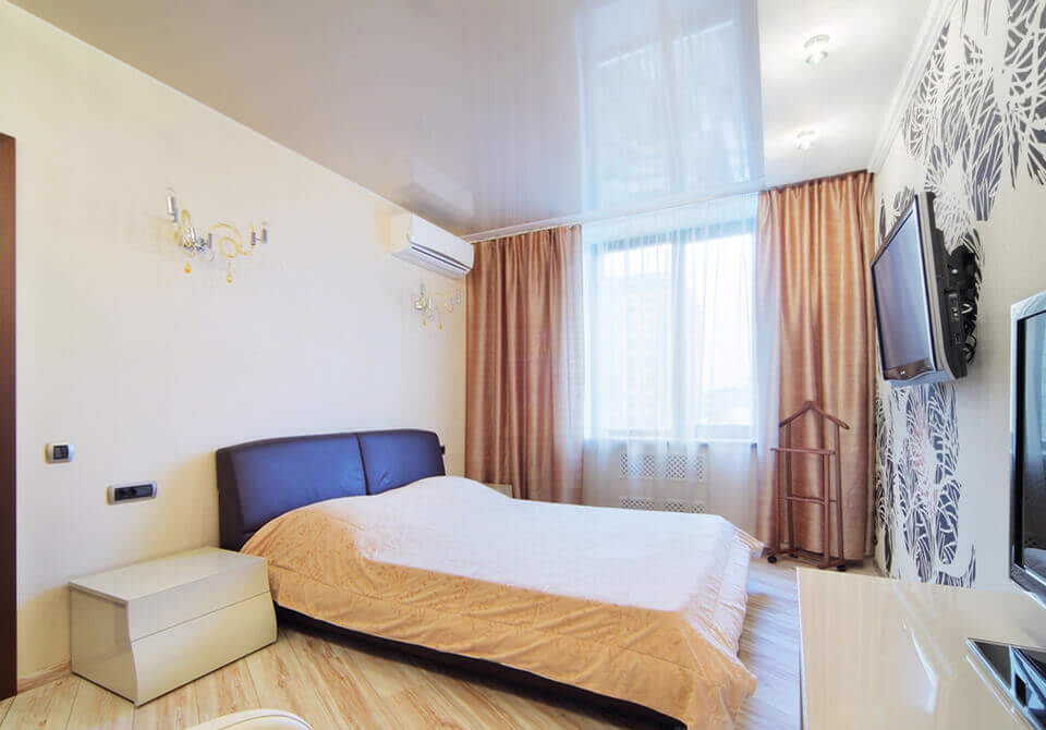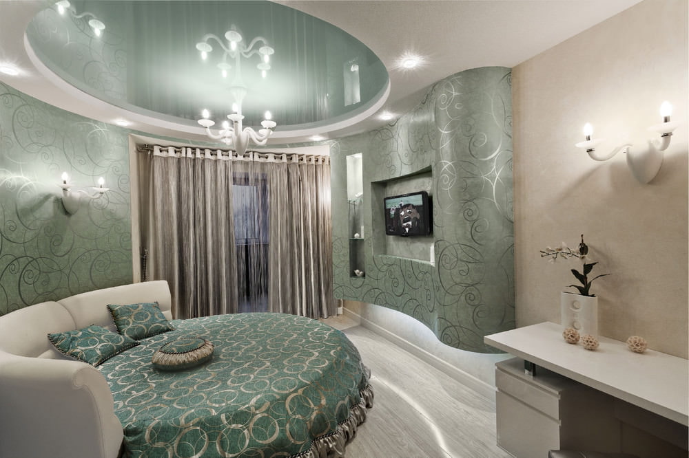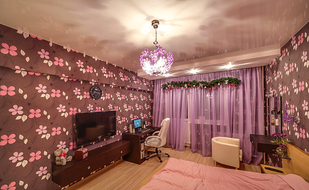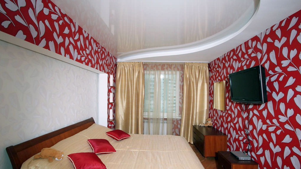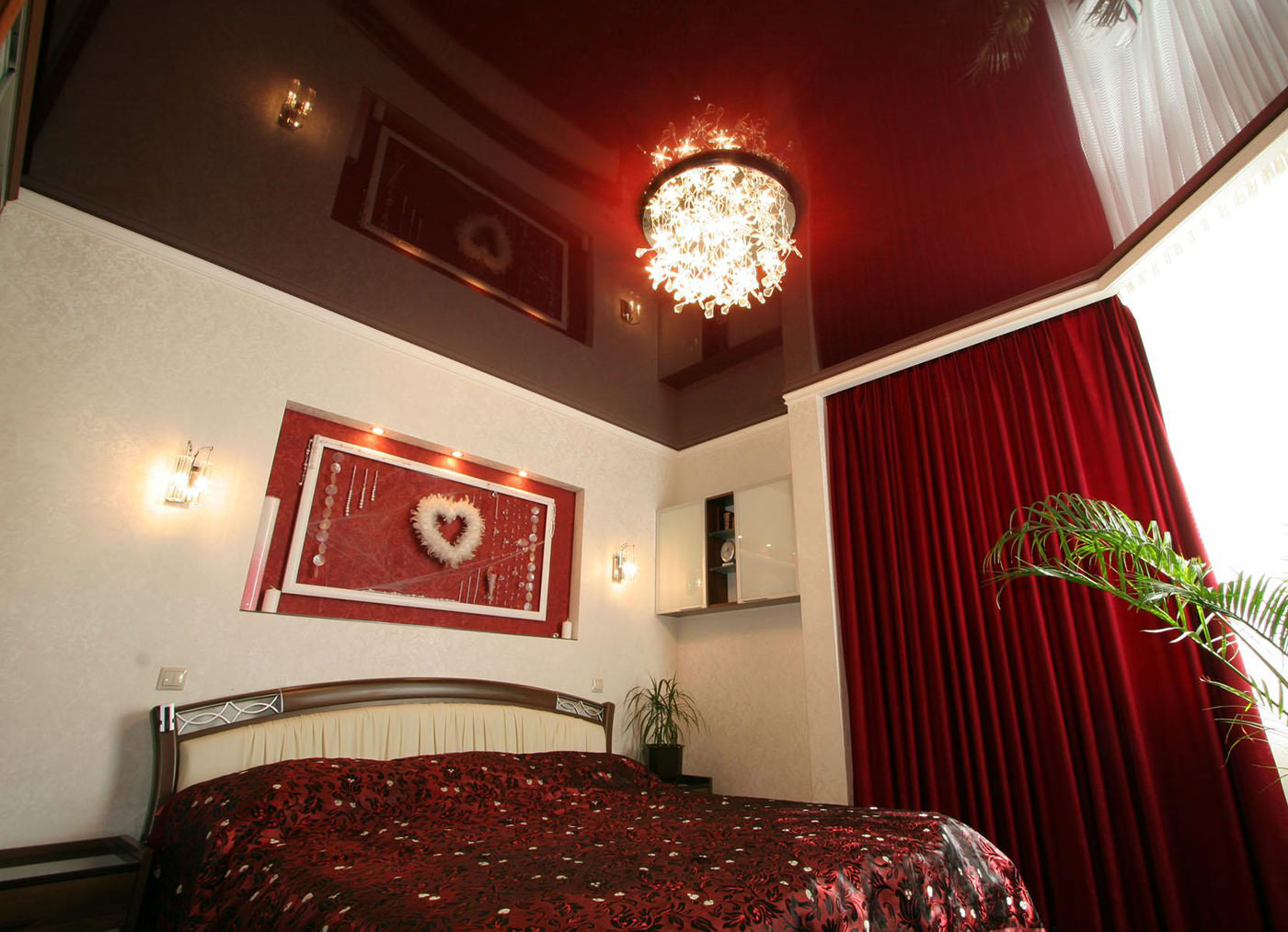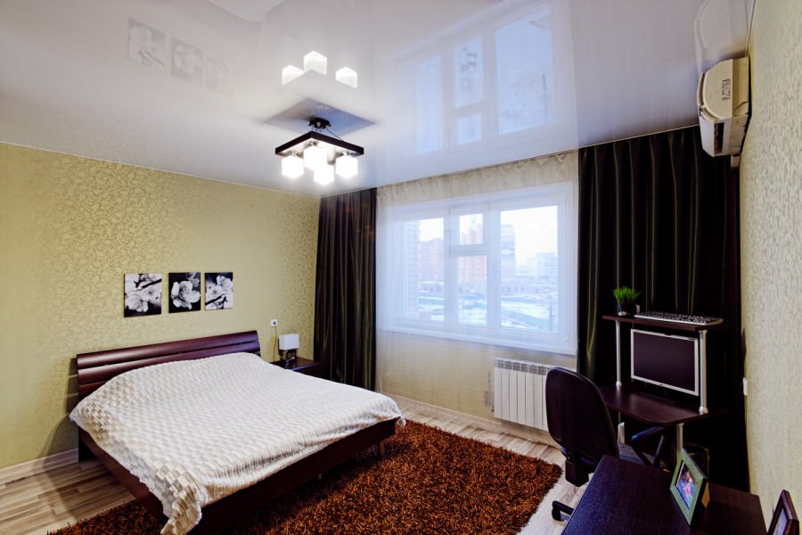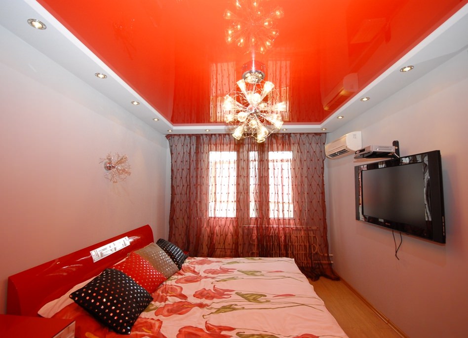Les plafonds tendus dans la chambre réduiront non seulement le temps de réparation, mais aideront également à ajuster visuellement la hauteur de la pièce.