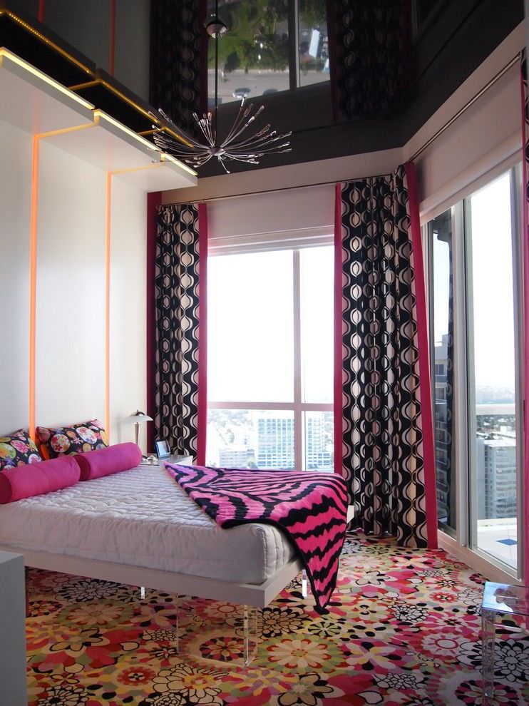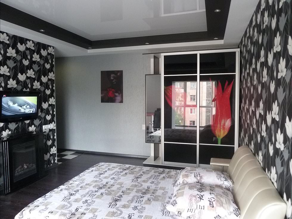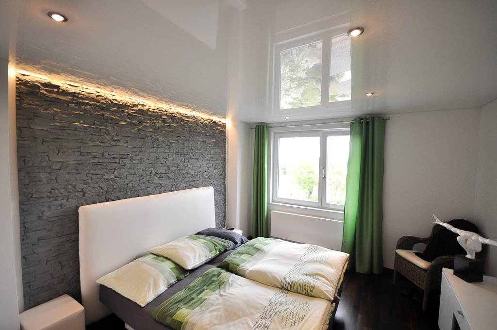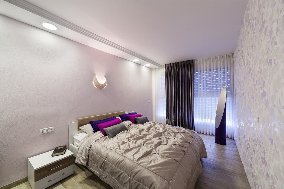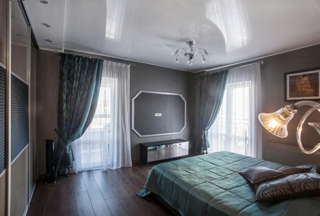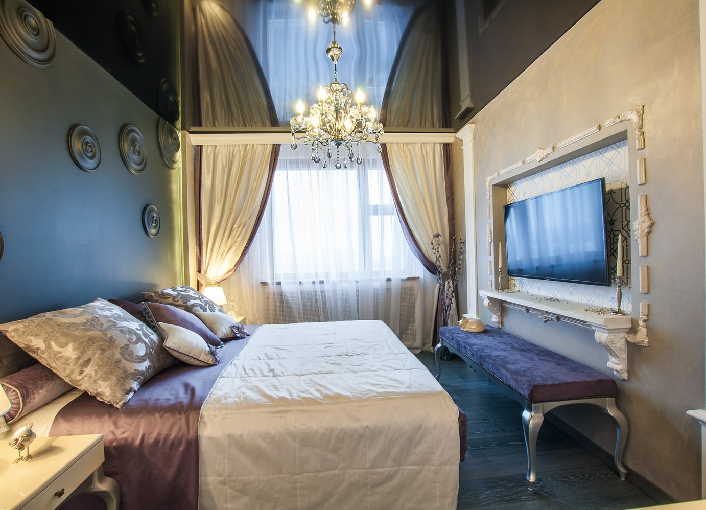 Les plafonds tendus dans la chambre réduiront non seulement le temps de réparation, mais aideront également à ajuster visuellement la hauteur de la pièce.
