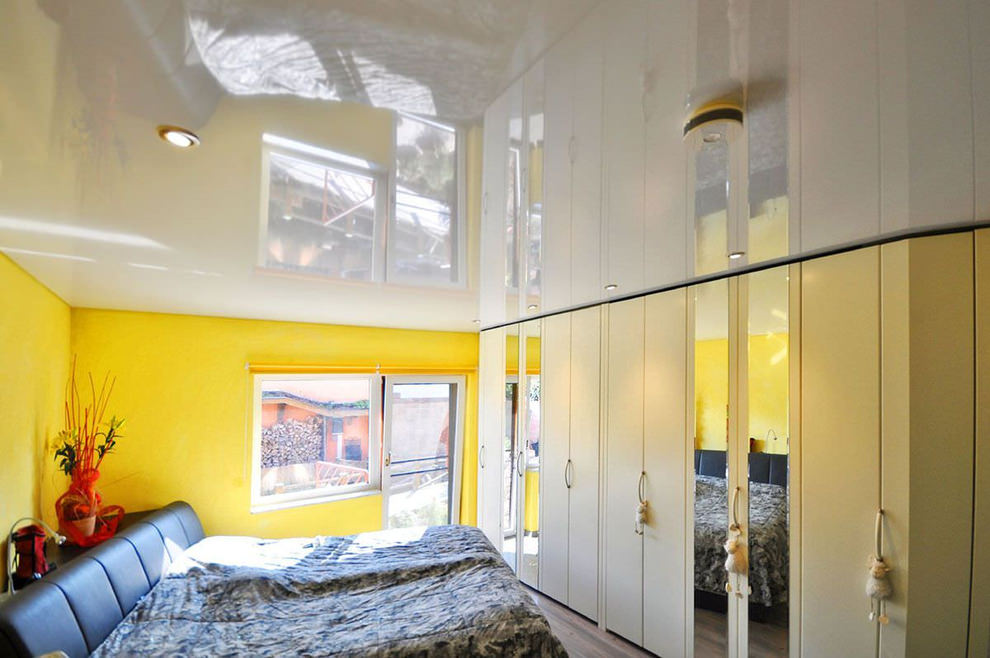 Une pièce large avec des plafonds bas devient visuellement deux fois plus haute si une toile de plafond brillante est utilisée pour la décorer.