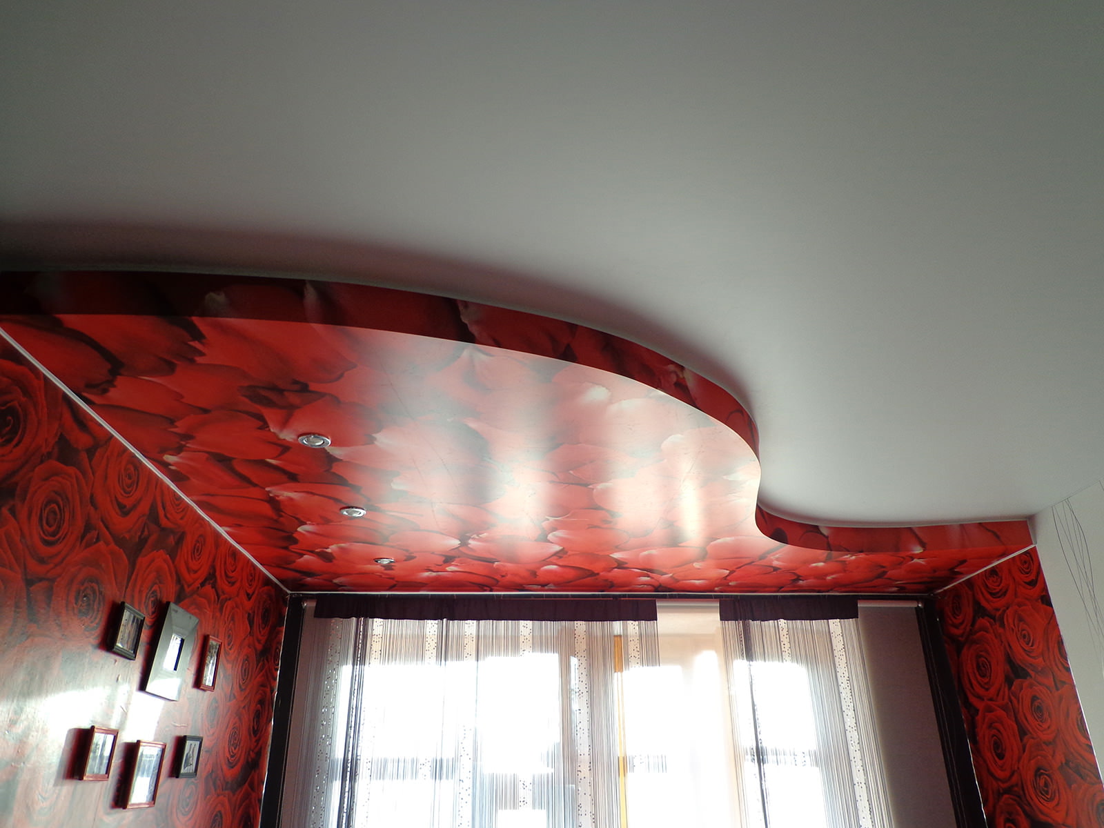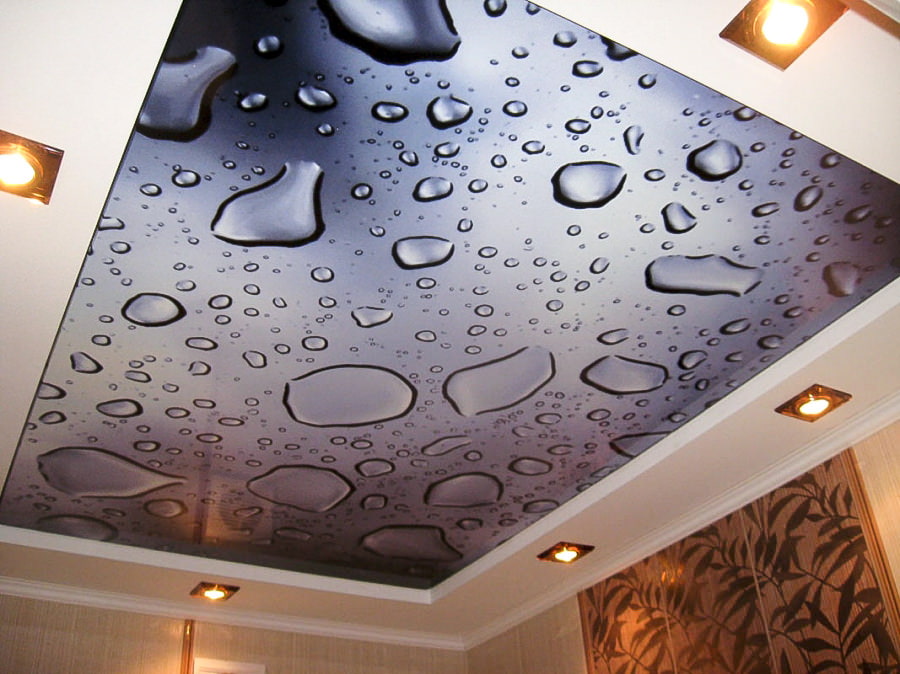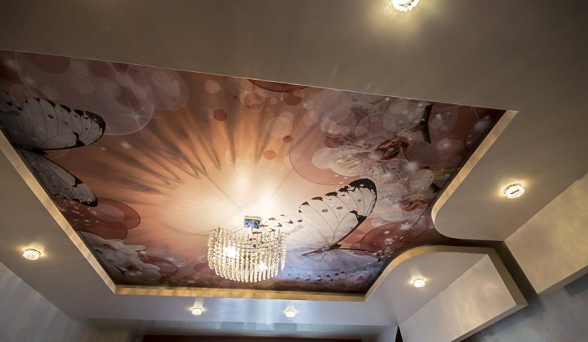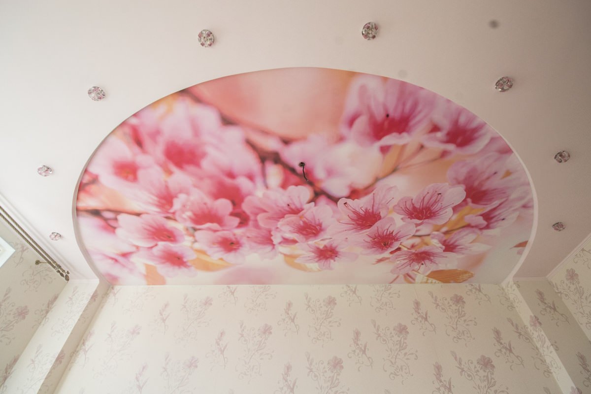 Vous souhaitez créer un intérieur lumineux et original? Faites attention au plafond tendu avec impression photo pour la chambre. L'impression photo est appliquée à l'encre sans odeur. Dessin - absolument aucune, même des photos du mariage.