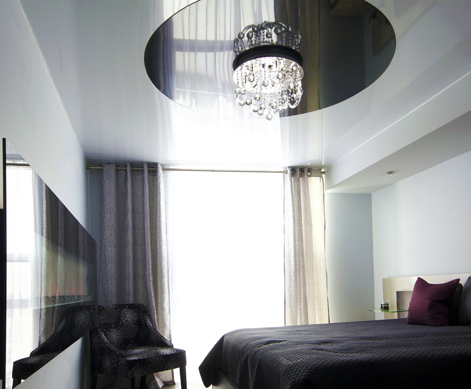 La toile brillante ou laquée a une surface réfléchissante brillante. Le degré de réflexion peut atteindre 90%. Il a l'air magnifique et augmente visuellement la surface de la pièce, "soulevant" le plafond. Il convient de noter que les lampadaires du soir et les enseignes au néon se refléteront également sur la surface du vernis. Des rideaux denses devront être prévus pour la chambre.