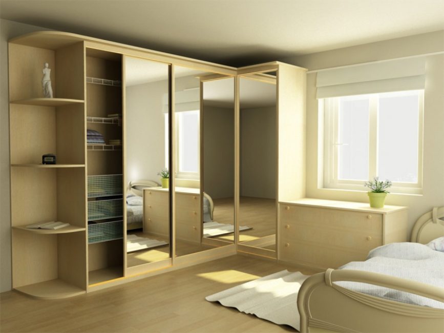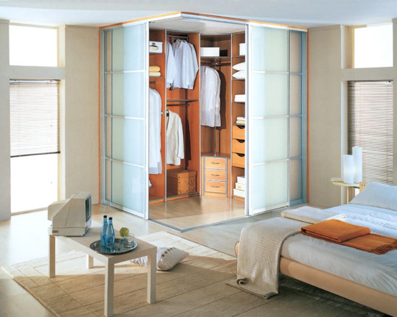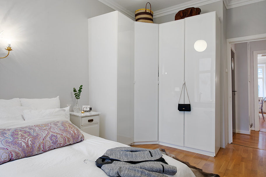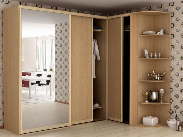 L'avantage de l'armoire d'angle dans la chambre est qu'elle prend peu de place en raison de la conception unique.