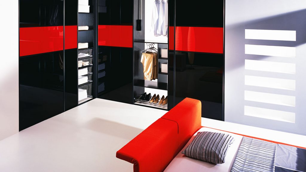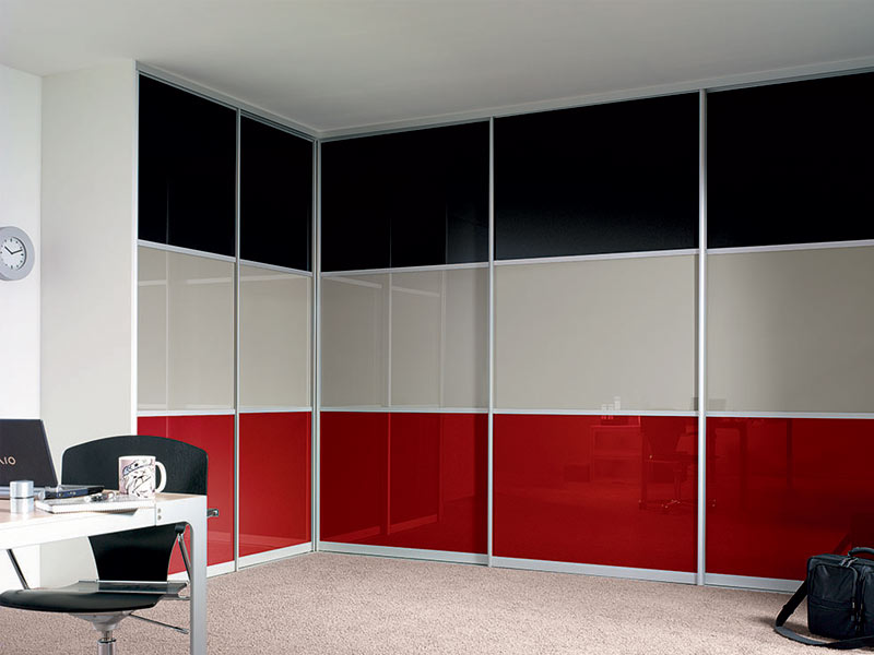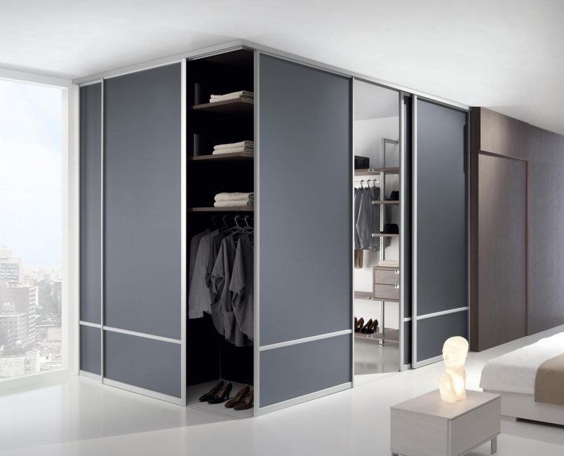 Ajustement coulissant pour le modèle en diagonale et en L, dans d'autres cas, les battants sont utilisés. De plus, des portes sont parfois installées pour de petites armoires qui s'ouvrent vers le bas ou vers le haut - selon le principe du buffet.