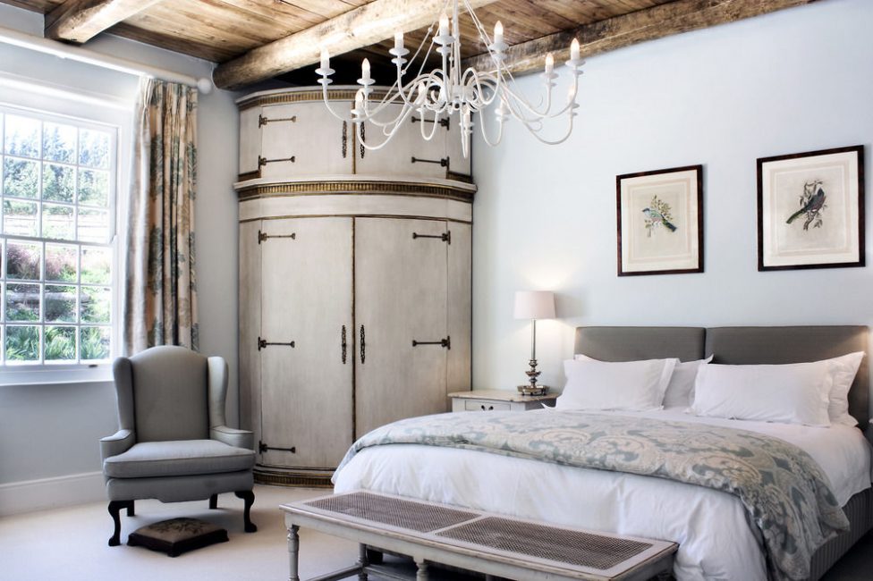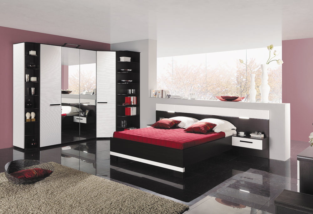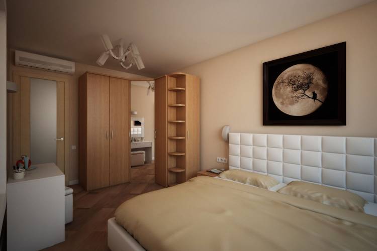 - Si la pièce est plus large et que j'aimerais la rallonger un peu, placez l'armoire et le lit dans des coins opposés. Ensuite, la pièce s'étire visuellement.