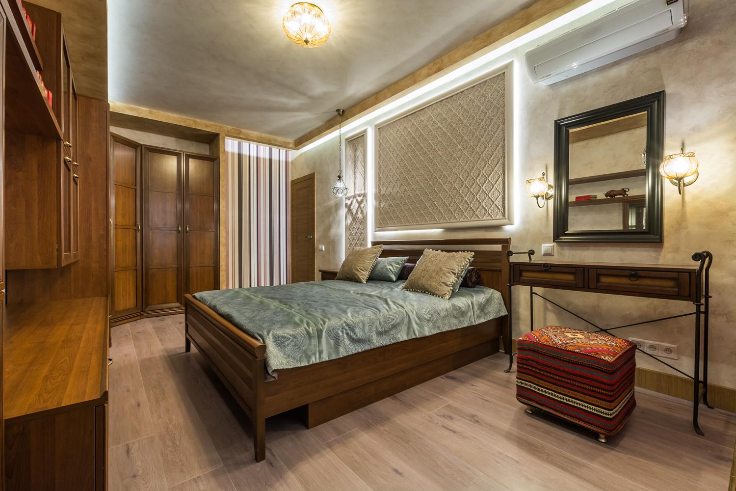 - Un grand nombre d'éléments décoratifs dans la décoration. Une attention particulière est portée à la tête du lit.