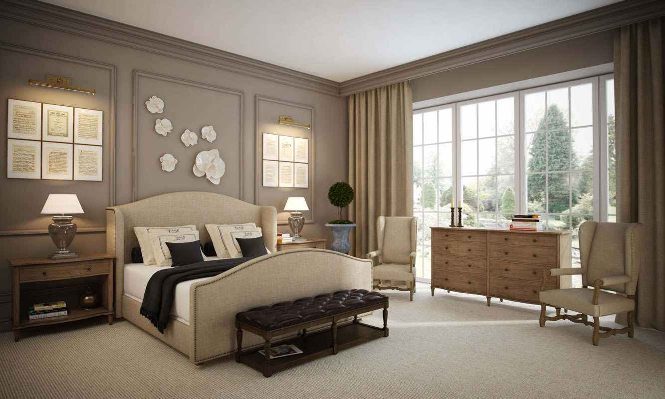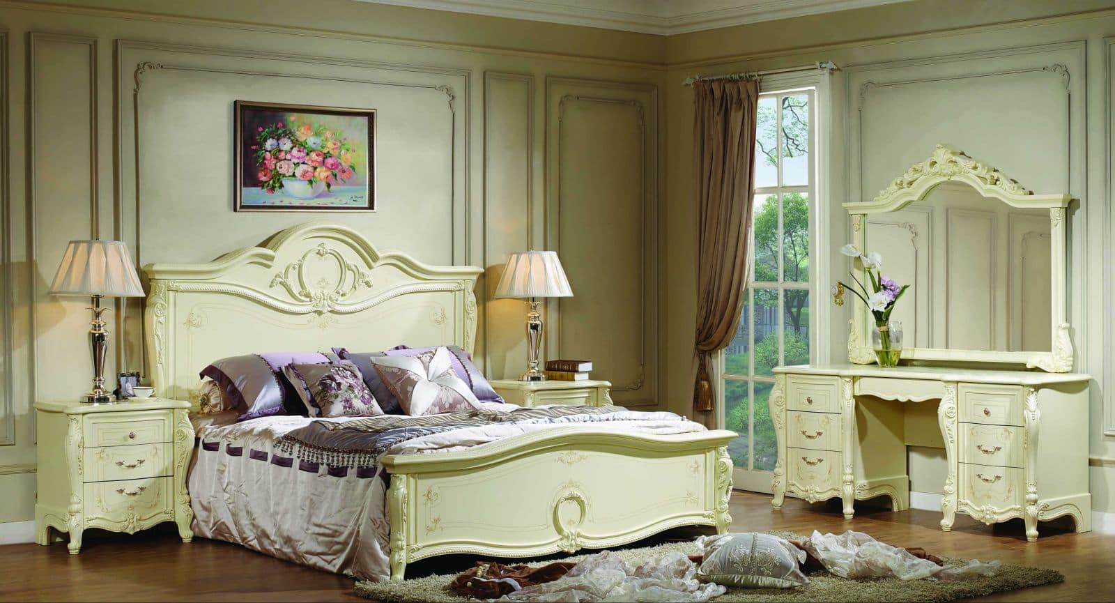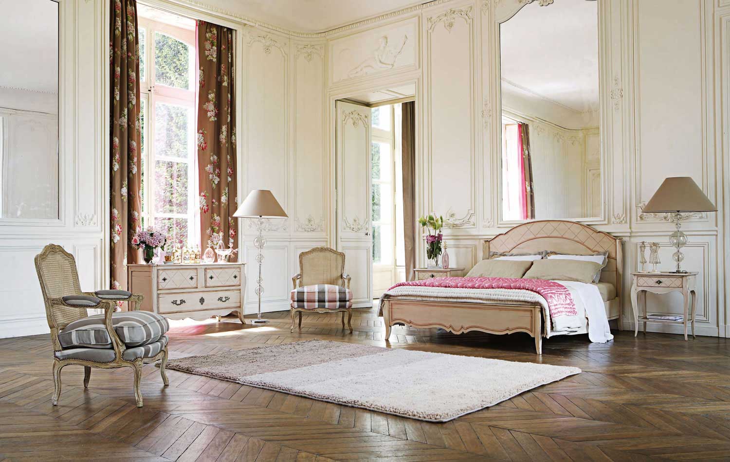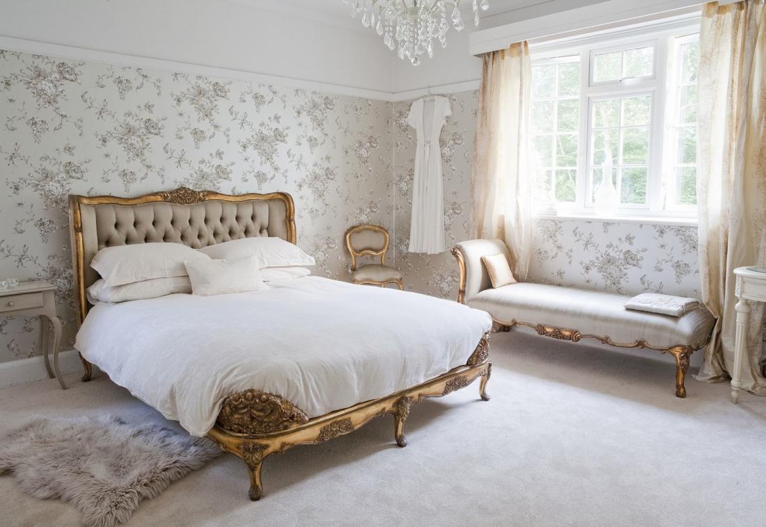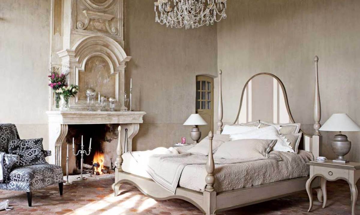 De préférence avec des poteaux en bois et une tête de lit sculptée. Situé au centre. Le choix du reste du mobilier dépend du lit.
