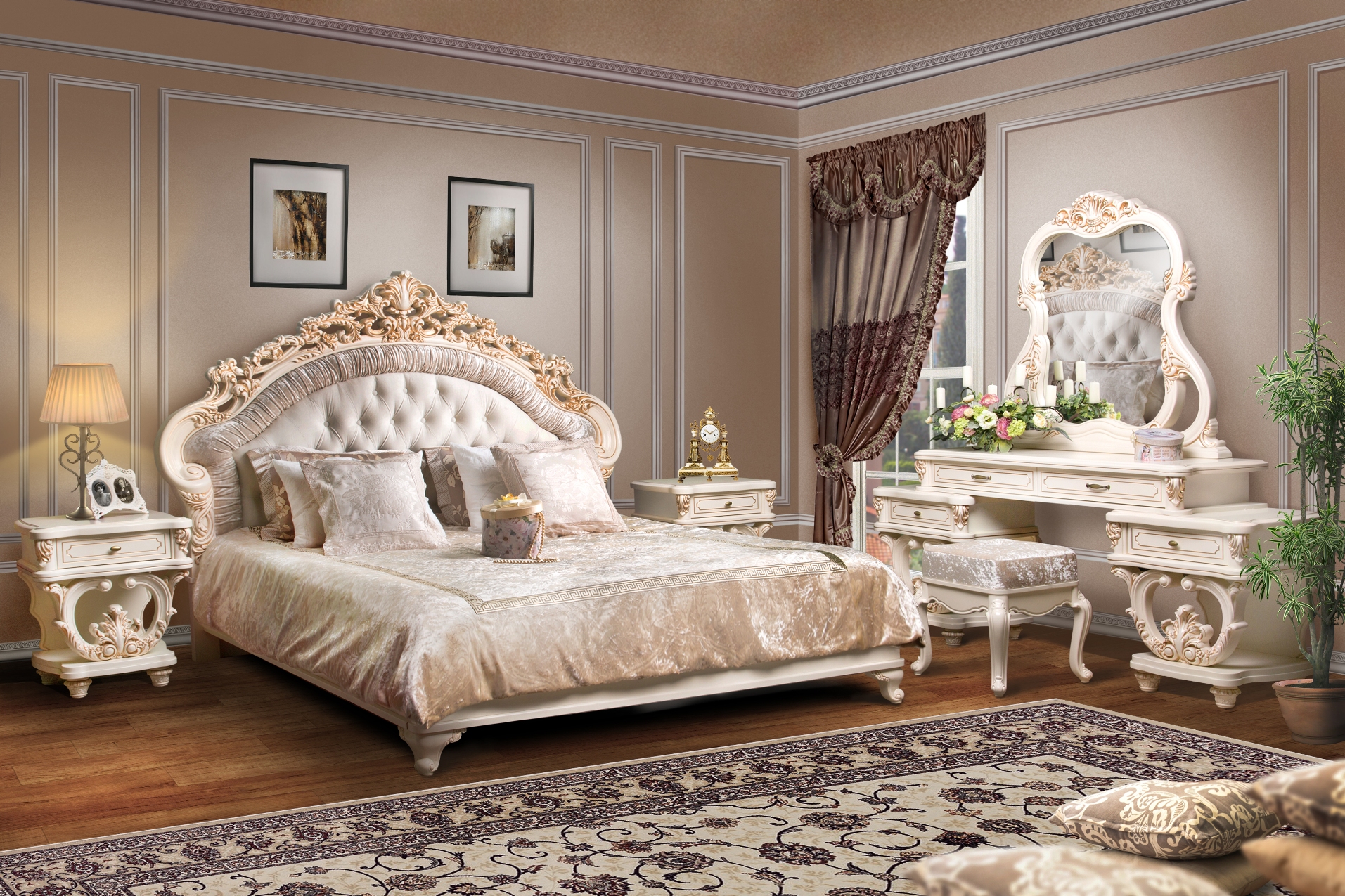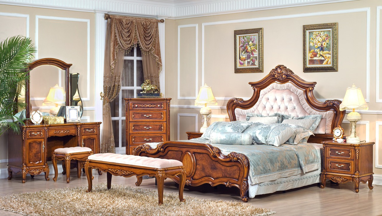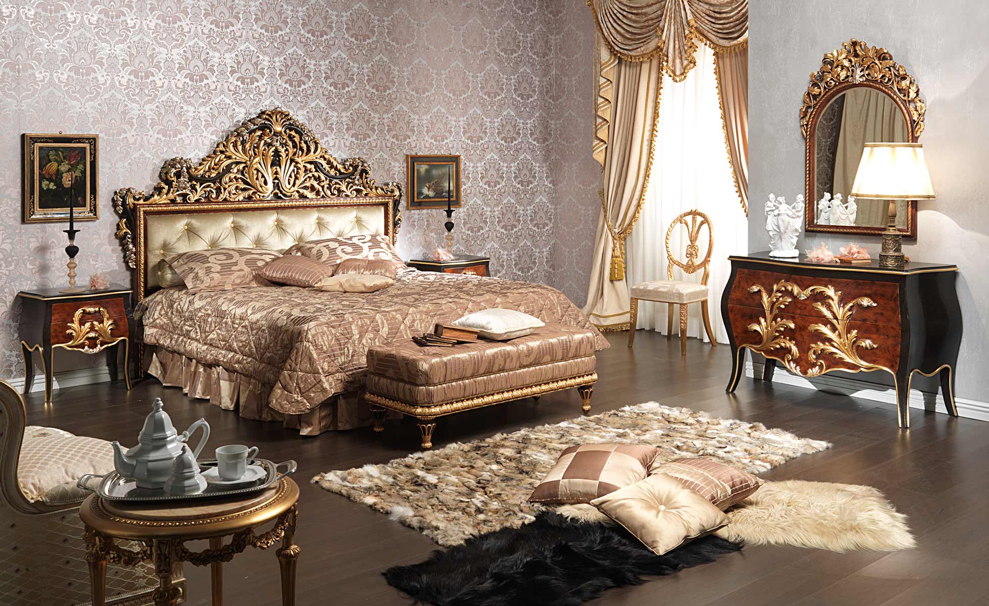 Mobilier en bois coûteux, rembourré en soie, velours, suède - une option familière à la chambre dans un style classique.