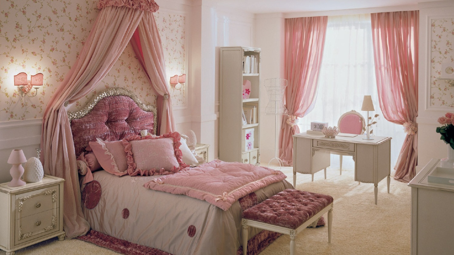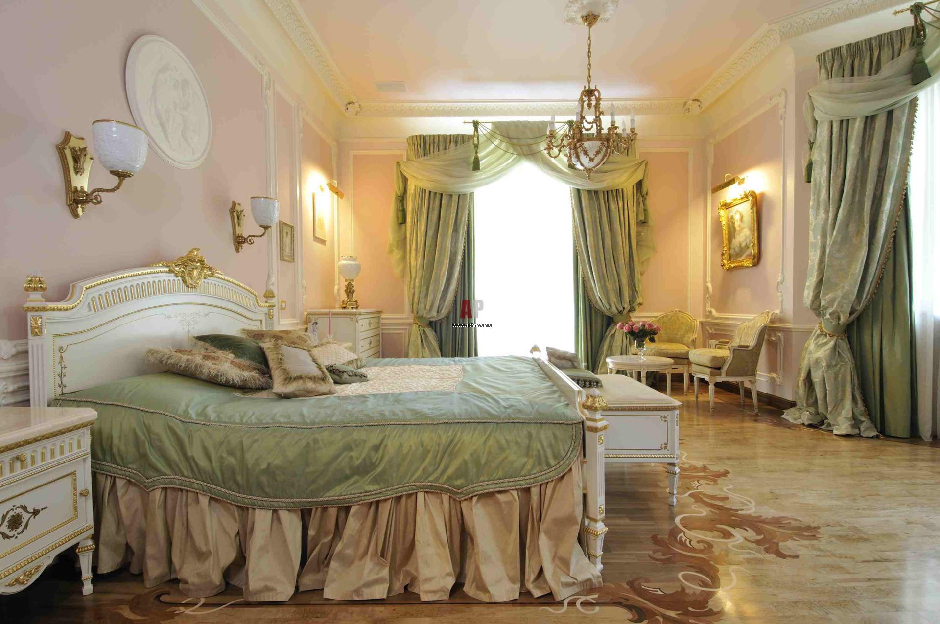 - Tapis et textiles coûteux et de haute qualité. L'abondance d'oreillers sur le lit et d'immenses rideaux denses avec un lambrequin et du tulle. Le style classique respecte les tissus naturels.