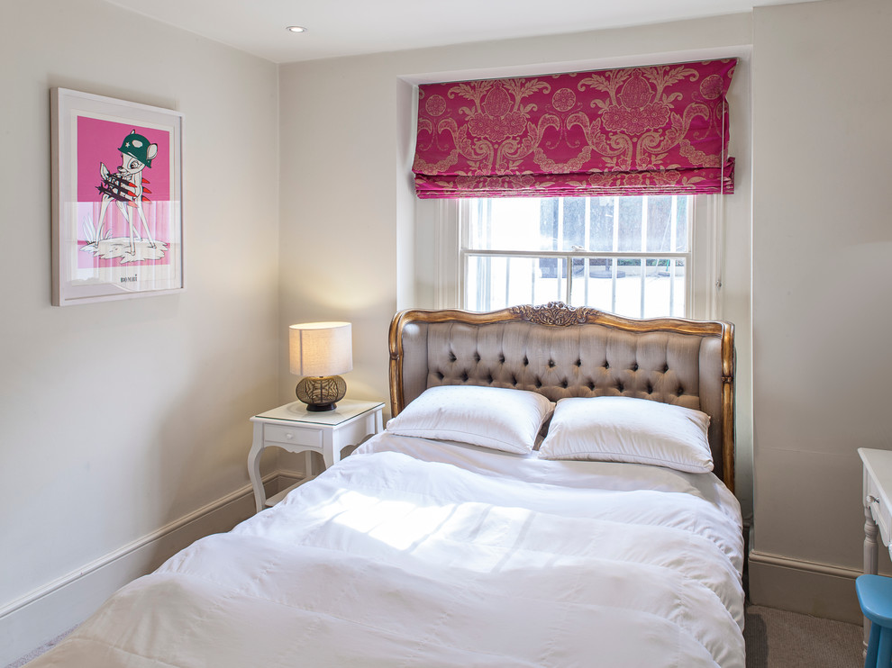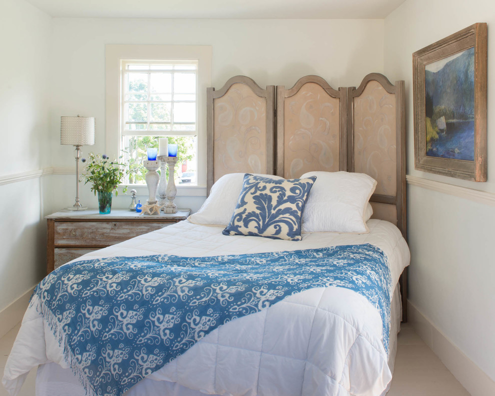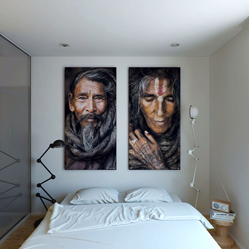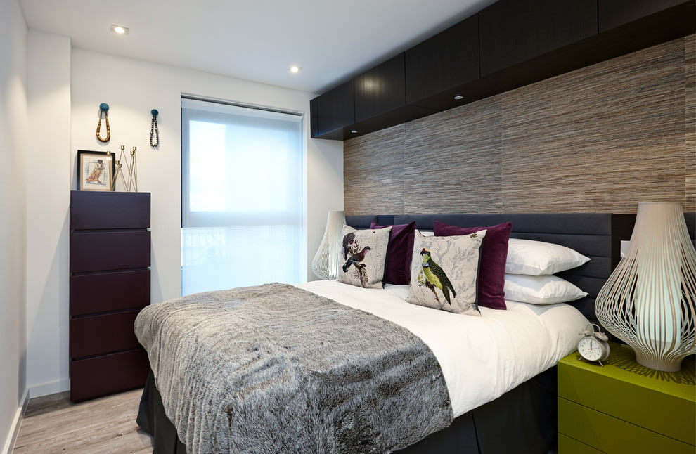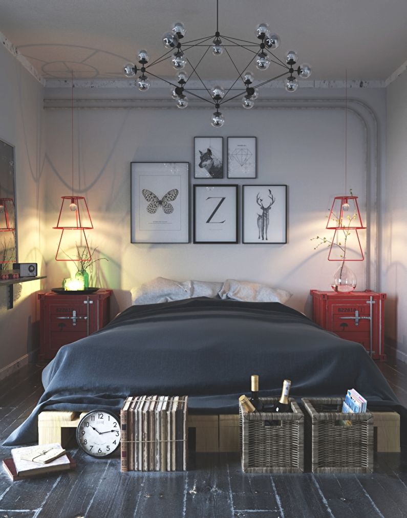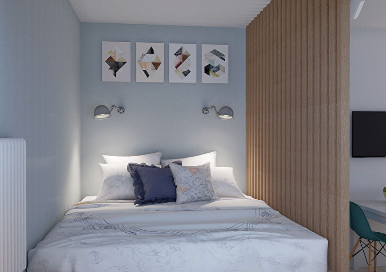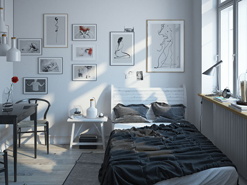 La chambre peut avoir un décor laconique, par exemple, des peintures dans des cadres stricts au-dessus de la tête du lit