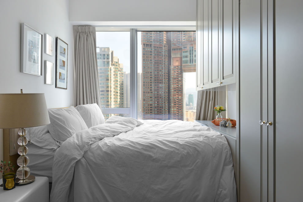 Dans la chambre étroite, il y aura plus d'espace libre si le lit est placé le long d'un mur court. Par exemple, à une fenêtre où vous pourrez profiter de la vue, en vous réveillant tôt le matin