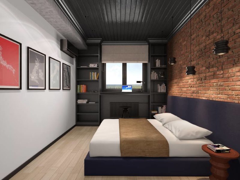 Le style loft se caractérise par des murs nus, sur lesquels la brique est clairement dessinée, une disposition ouverte de fils et de câbles de câblage. Habiller la chambre à coucher en utilisant divers outils, appareils et indicateurs d'attention utilisés dans la production. Le lit de couchage peut être constitué de palettes, armoires et étagères vieillies - en bois ou en métal. Les dispositifs d'éclairage doivent être simples, mais fournir un éclairage suffisant dans tous les coins de la pièce.
