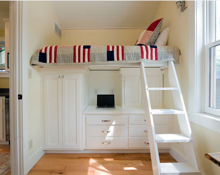 - Utilisation de l'espace sous le lit pour les vêtements et le linge de lit (une variante avec un canapé pliant ou avec un lit pliant est possible).