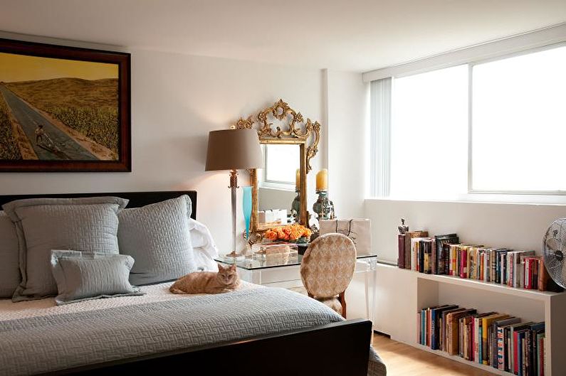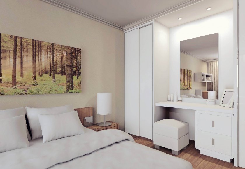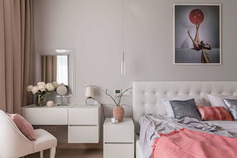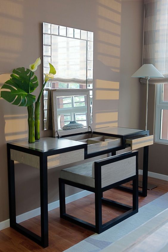 Une coiffeuse compacte au lieu d'une table de chevet est une pratique assez courante dans les chambres modernes.