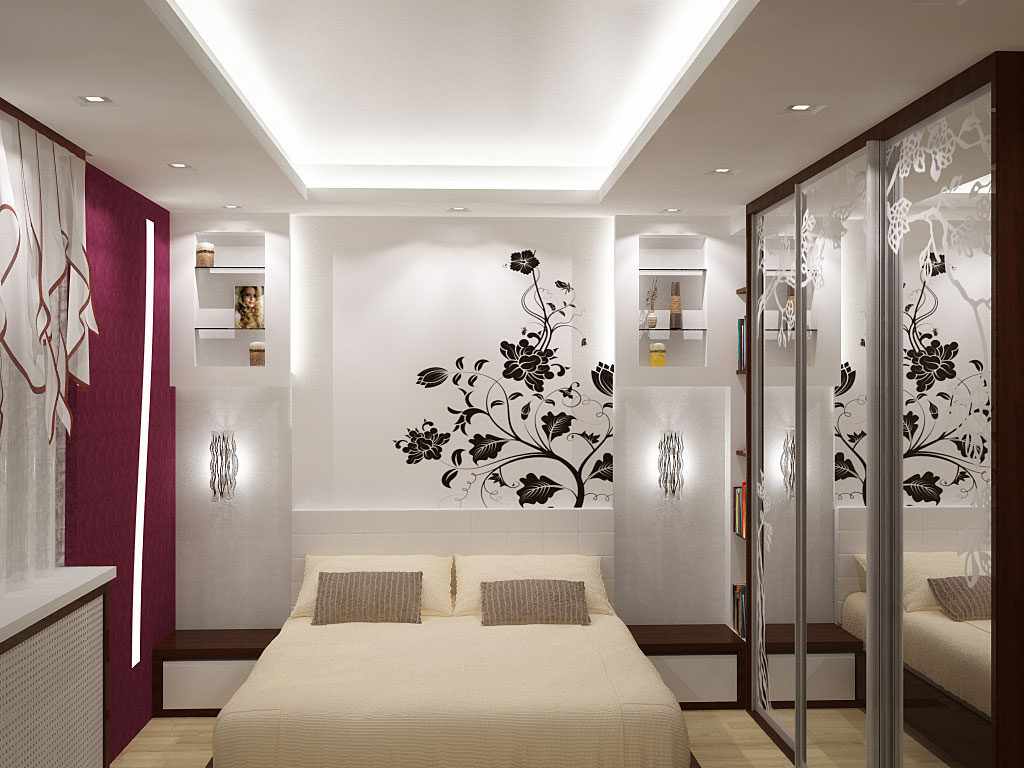 Au lieu d'une armoire encombrante, vous pouvez accrocher de petites étagères autour du périmètre. Cela ajoutera des centimètres supplémentaires et décorera la pièce lors de l'organisation des objets avec goût. Achetez une petite commode avec des miroirs pour agrandir visuellement l'espace. Pas besoin de forcer tout l'espace. La pièce doit avoir suffisamment d'espace pour la libre circulation. Considérez - la couleur différente des meubles augmente ou diminue la taille visuelle de la pièce. La couleur blanche et les surfaces réfléchissantes augmentent la taille de la pièce et les tons sombres et les surfaces mates la réduisent.