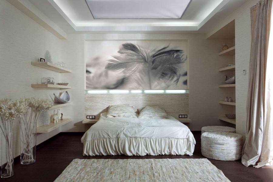 La forme et la taille de la pièce doivent également être prises en compte. Dans un petit espace, les couleurs claires joueront une "expansion", et le choix des couleurs sombres réduira visuellement la pièce. Dans une petite chambre, il est préférable de concevoir le plafond avec du blanc pur et les murs sans image. Dans ce cas, il n'est pas nécessaire de répéter le même design sur les quatre murs, vous pouvez "jouer" avec la couleur.