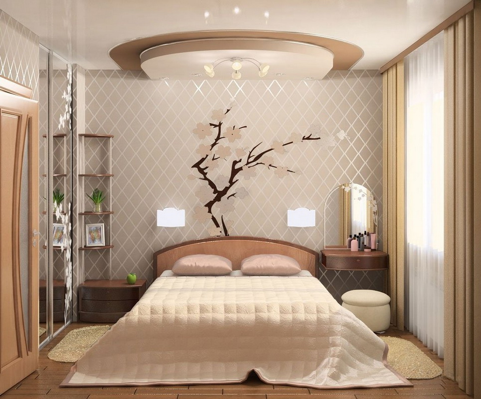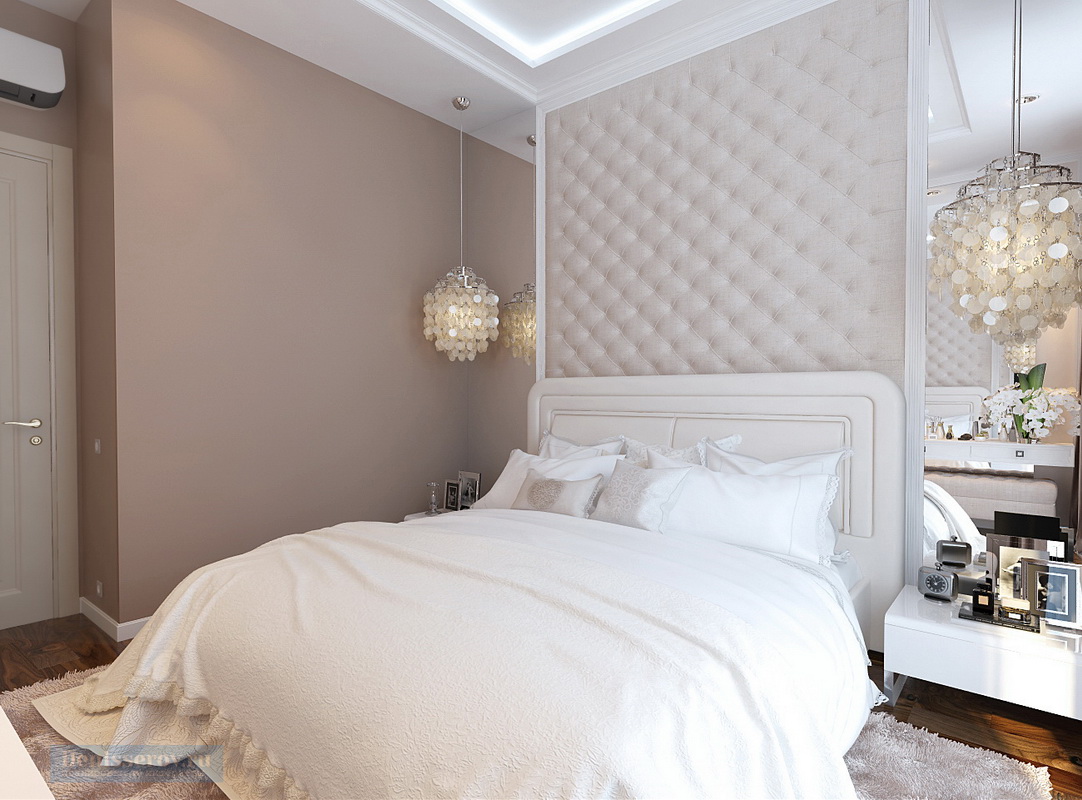 C'est tout, pour la décoration intérieure de la chambre de 14 m², la limite de surface a été épuisée. Laissez différentes tables de chevet, lampadaires et fauteuils pour les grandes chambres.