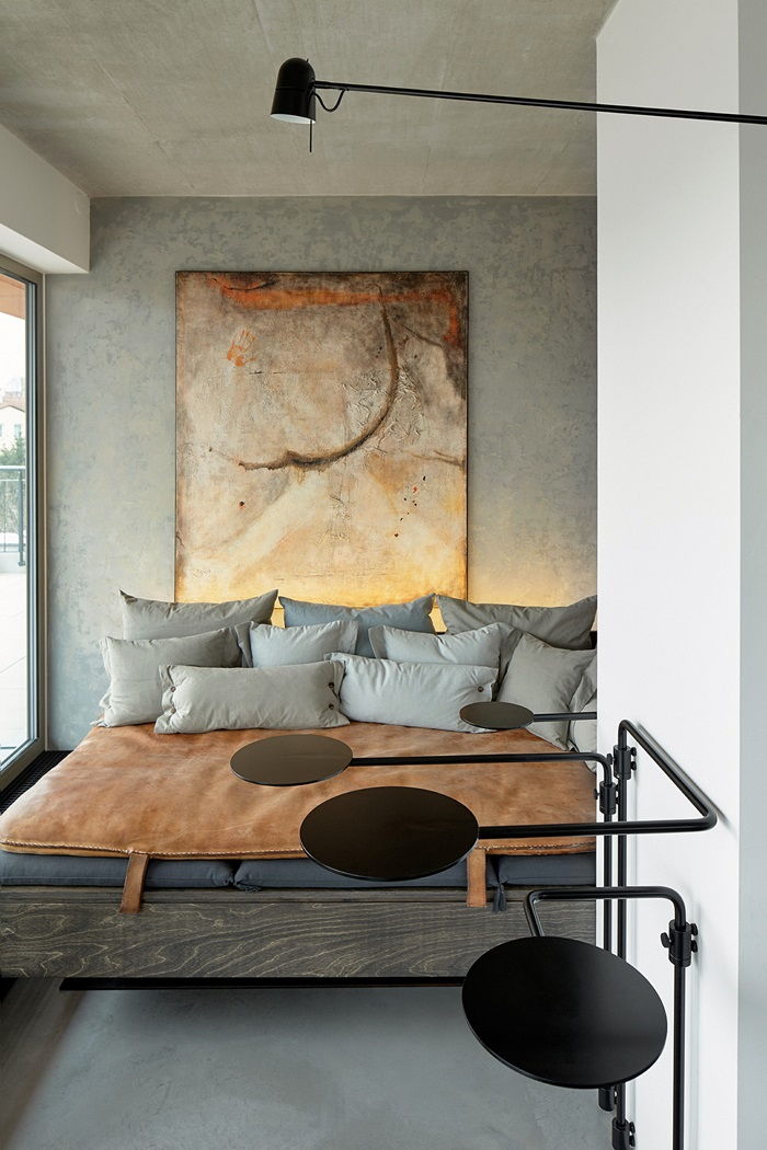 Les surfaces texturées délibérément rugueuses des murs et du plafond soulignent la tendresse et la précision impeccables de la literie et de quelques textiles.