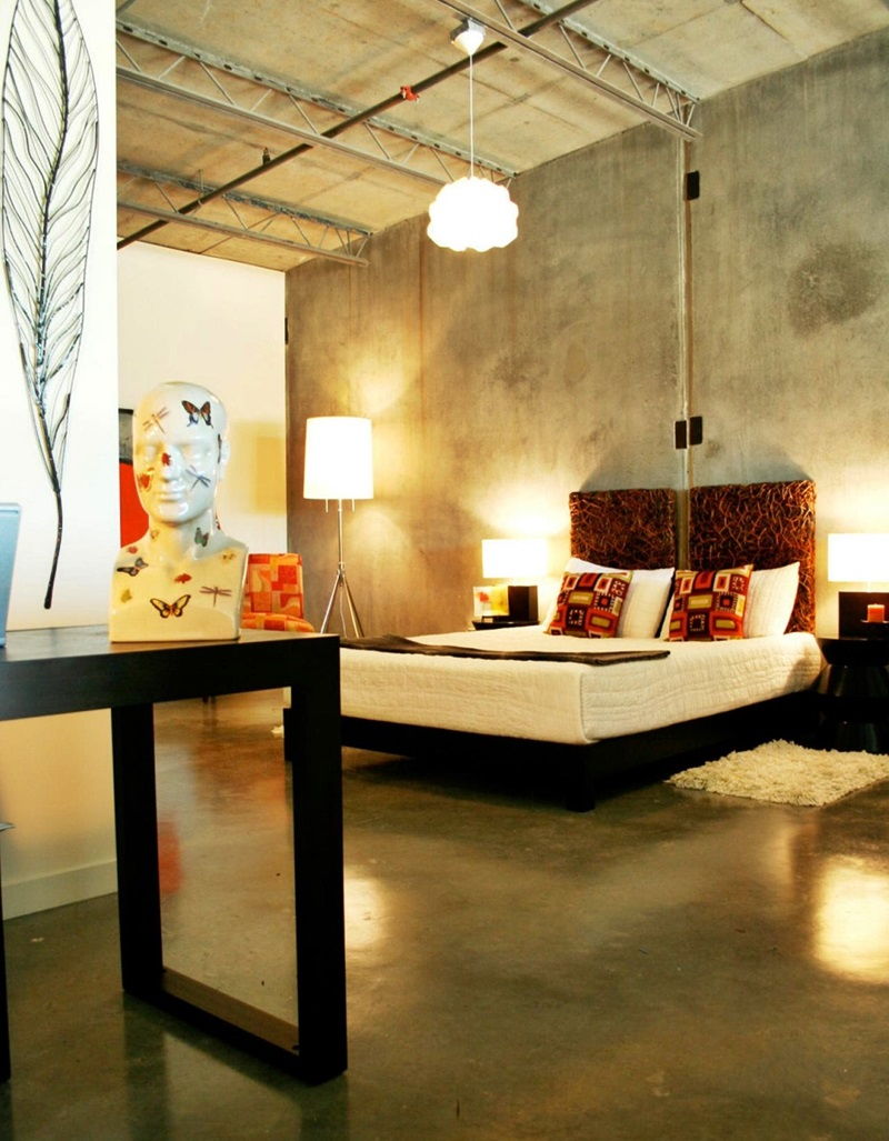 Pas besoin de vivre dans le grenier pour remplir votre chambre avec des éléments industriels du loft. De telles réparations sont bien réelles pour les appartements modernes. Permettez aux surfaces en ciment et en béton poli de compléter le décor, les meubles et les choix d'éclairage avec la même finition. Vous pouvez adoucir les éléments industriels avec une galerie inspirante et un mélange d'art moderne éclectique.