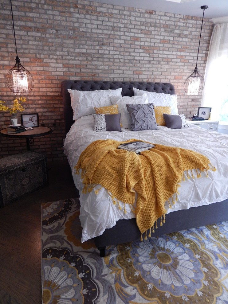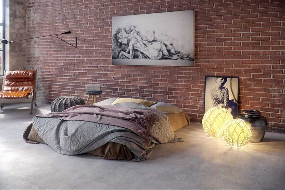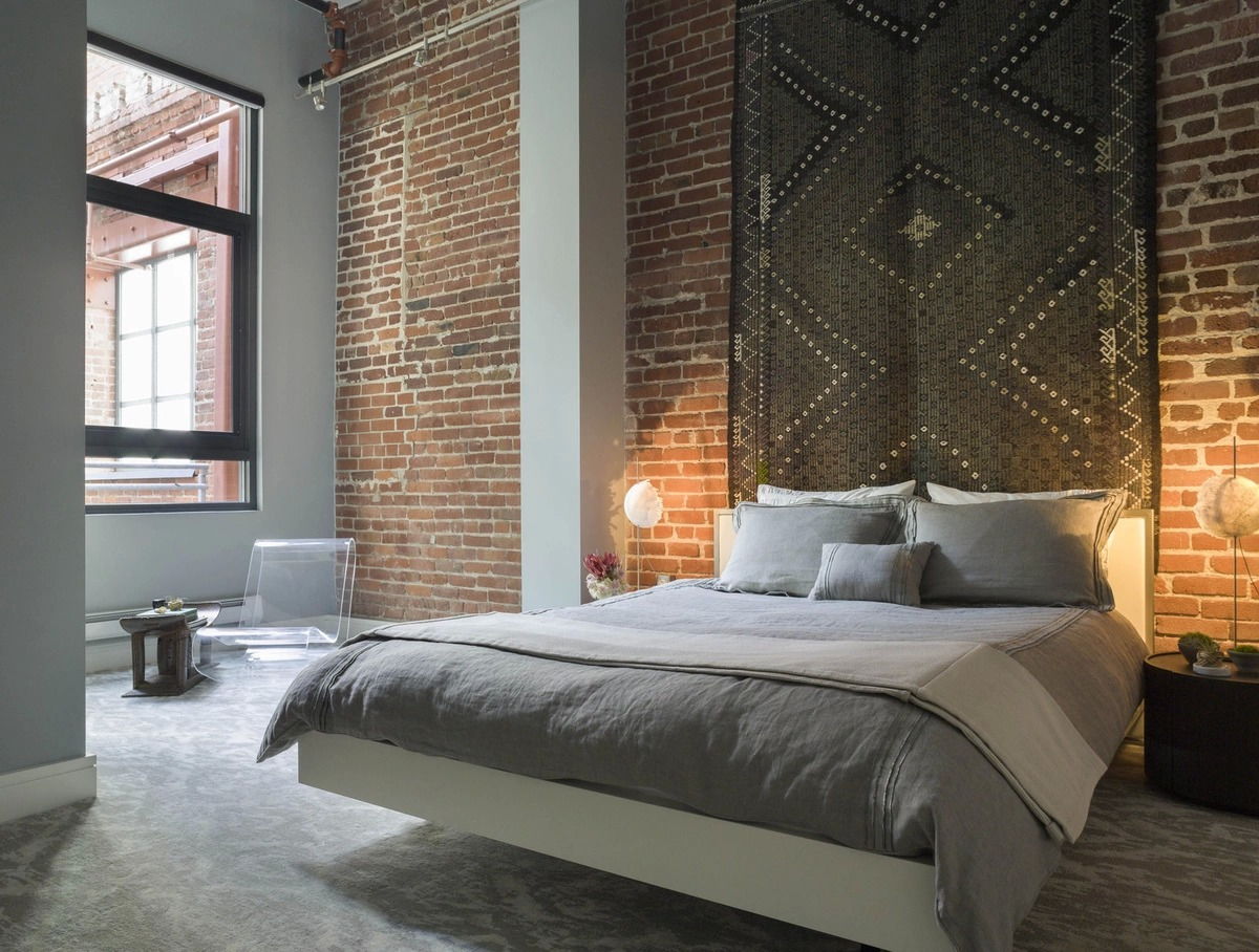 Un mur de briques ou son imitation de haute qualité peut être une excellente toile de fond pour un grand lit confortable.