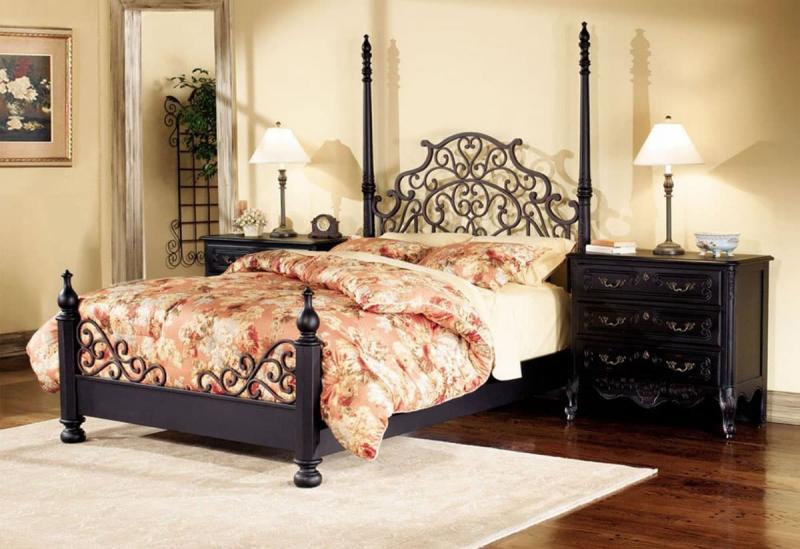 - Les produits forgés sont des «compagnons» de style obligatoires. Il peut s'agir de têtes de lit, de tables ou simplement d'éléments décoratifs sans but particulier. Grâce à eux, la chambre conserve l'atmosphère romantique de l'antiquité.