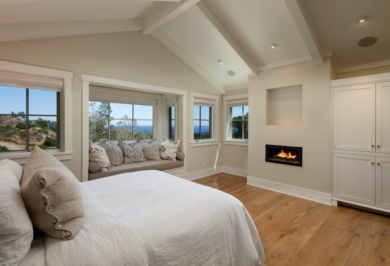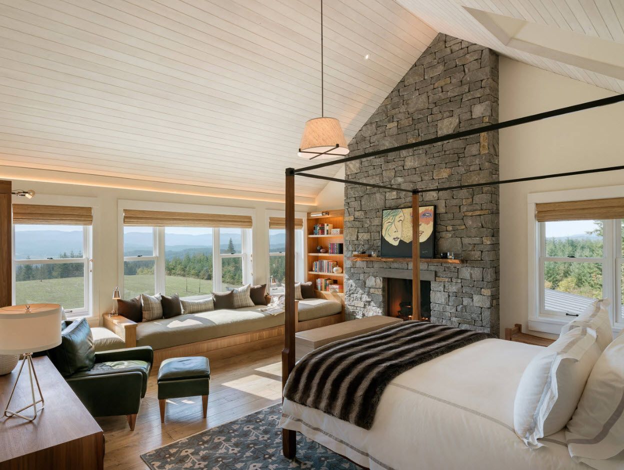 Sur une grande surface, vous pouvez autoriser tout projet audacieux: combiner une pièce avec un balcon ou un salon, installer une cheminée, aménager un dressing, un coin salon et bien plus encore.