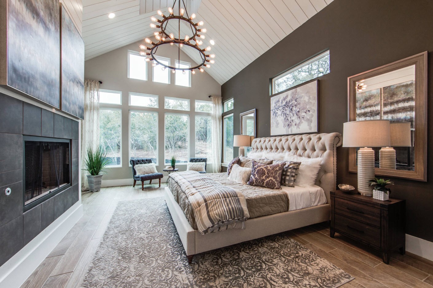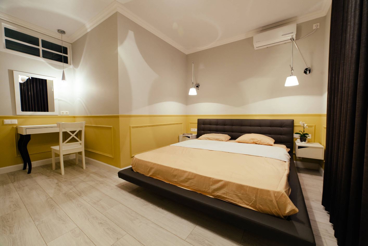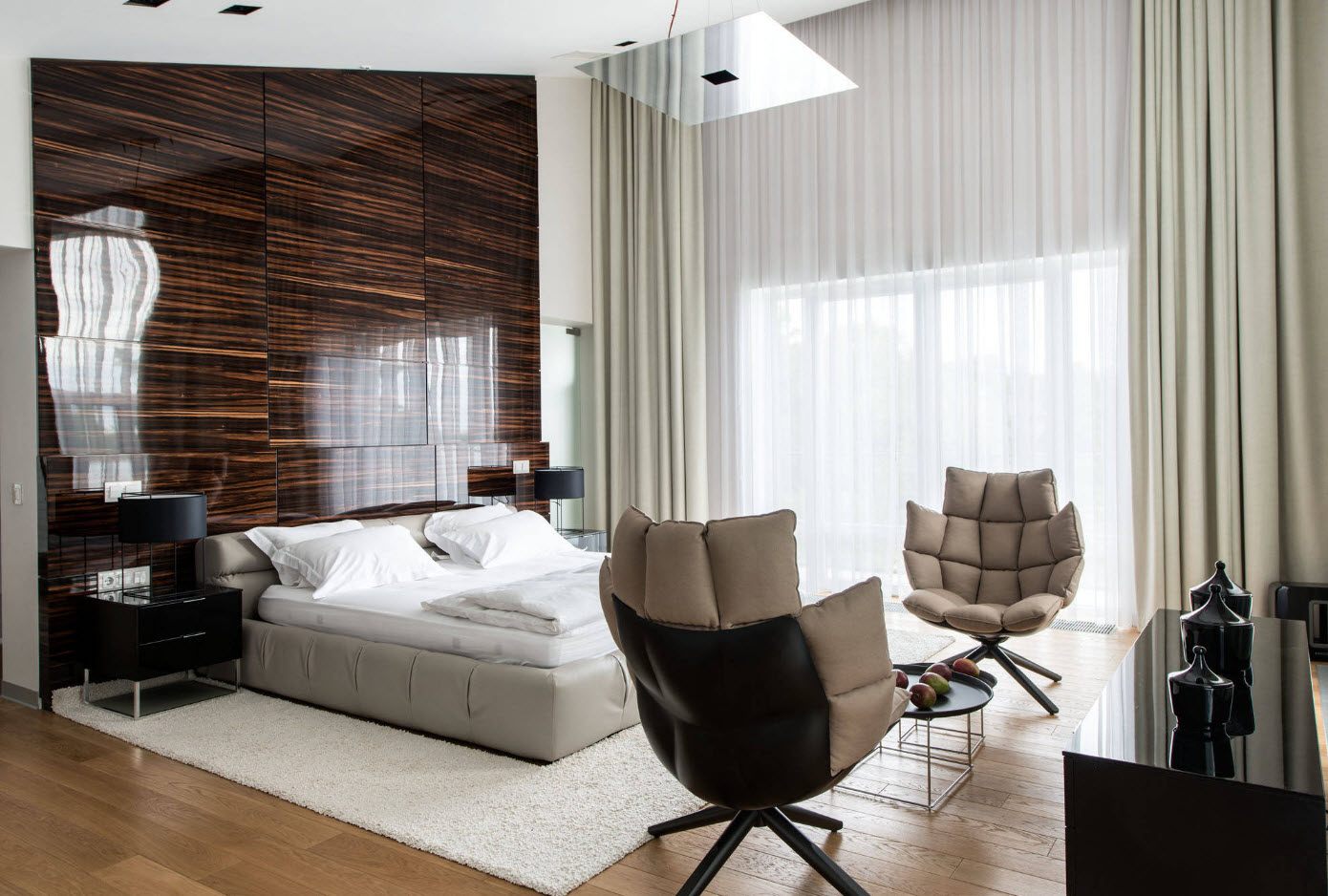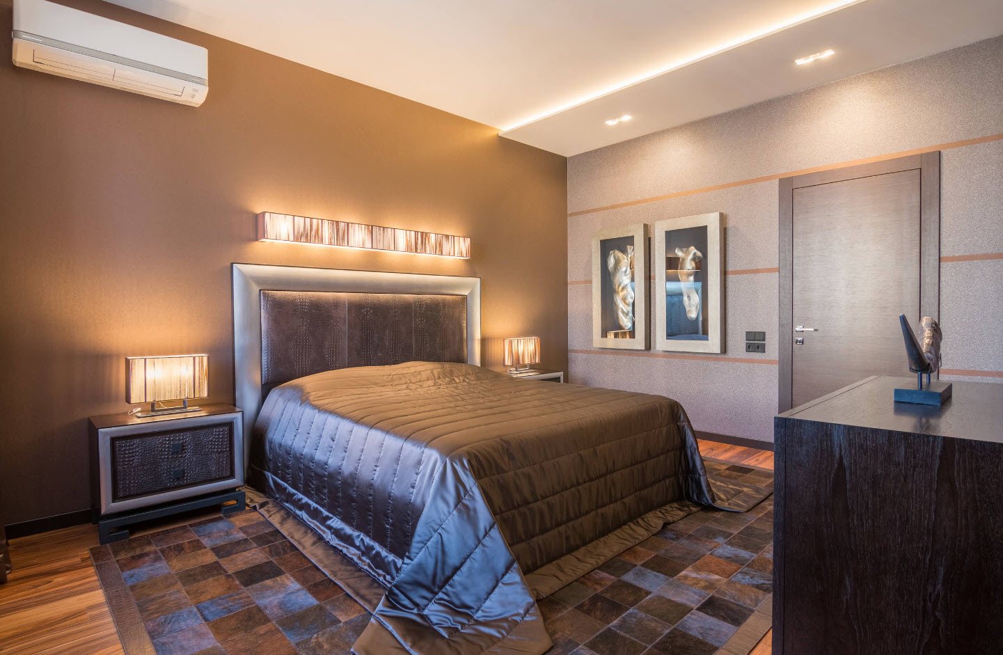 Idéal pour n'importe quel but de conception. Ici, il est recommandé de centrer le lit et de disposer le reste du mobilier pour y construire. Le design symétrique avec des tables de chevet, une armoire et un miroir est considéré comme classique.