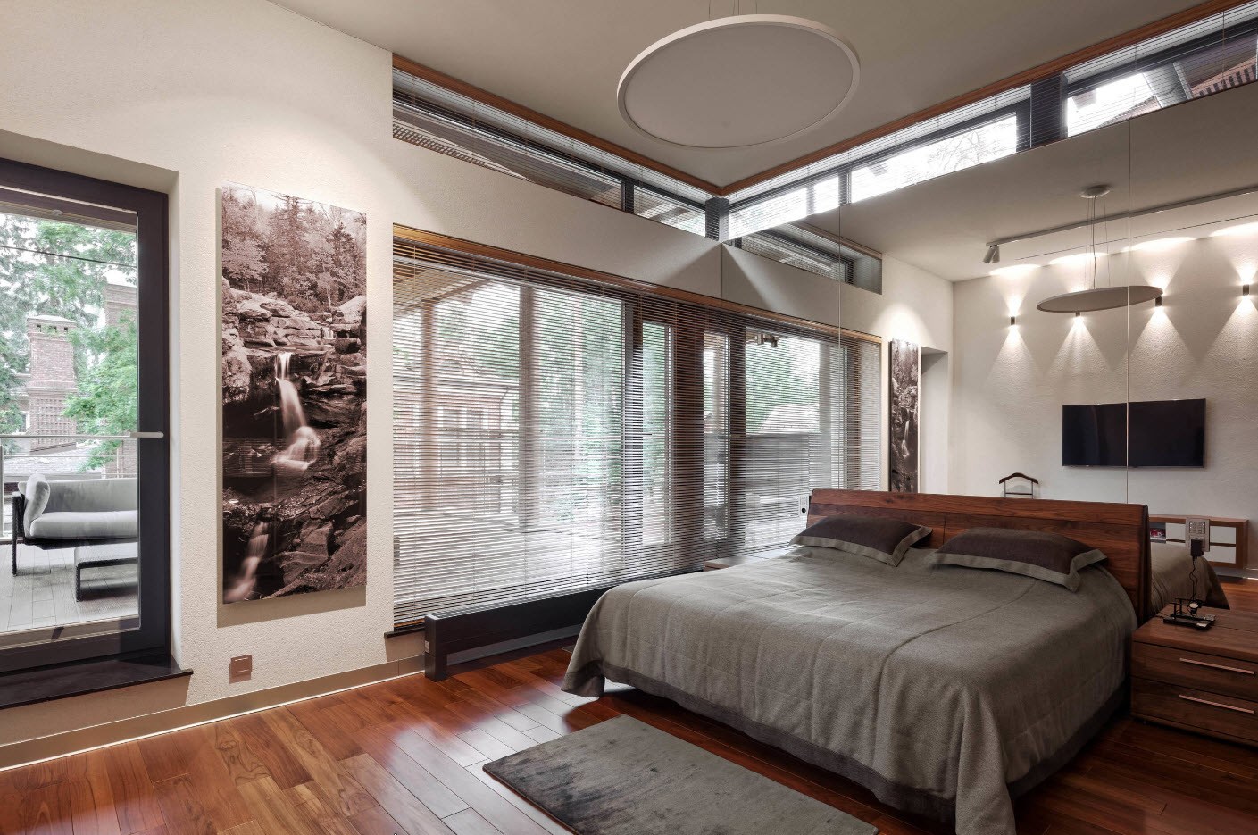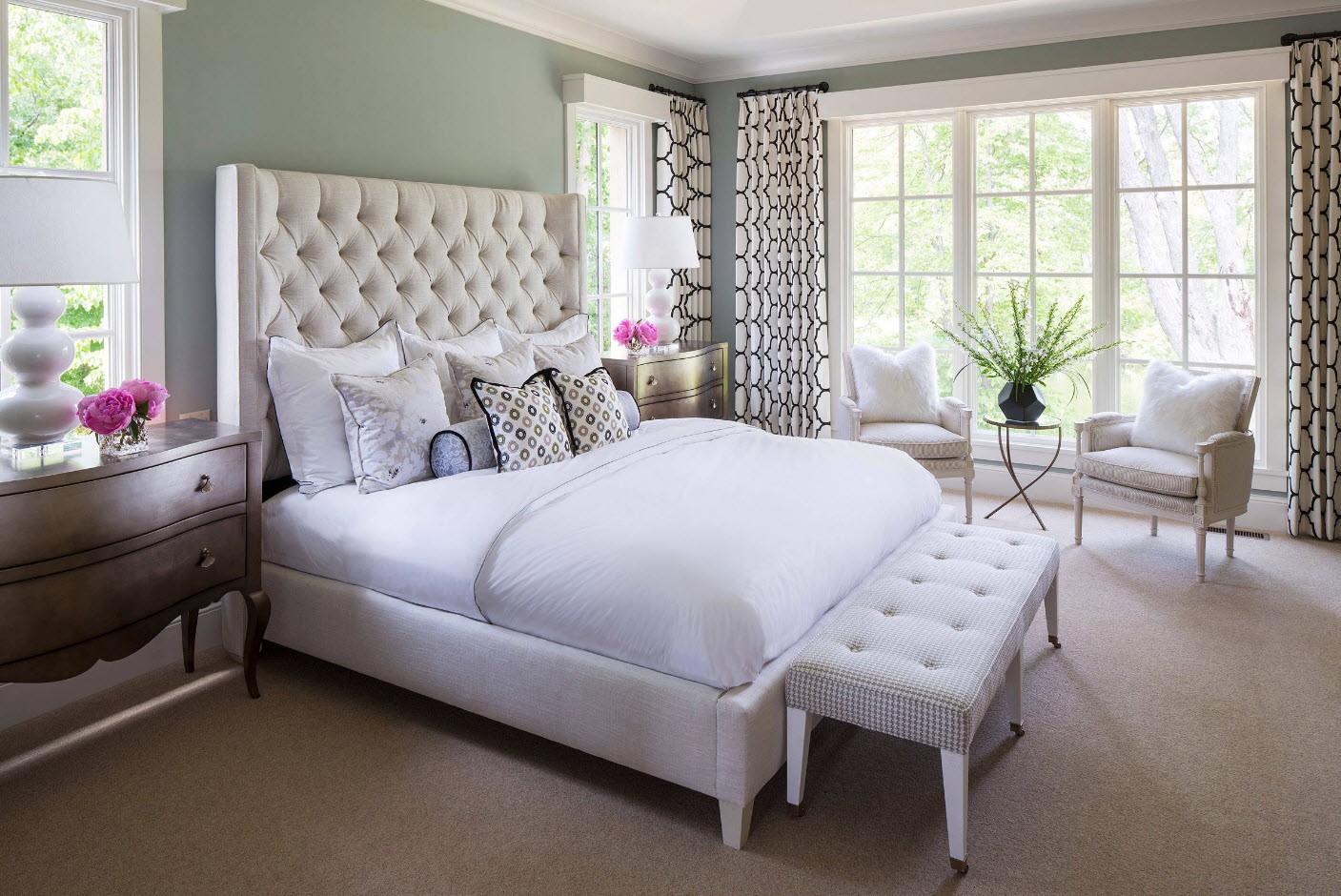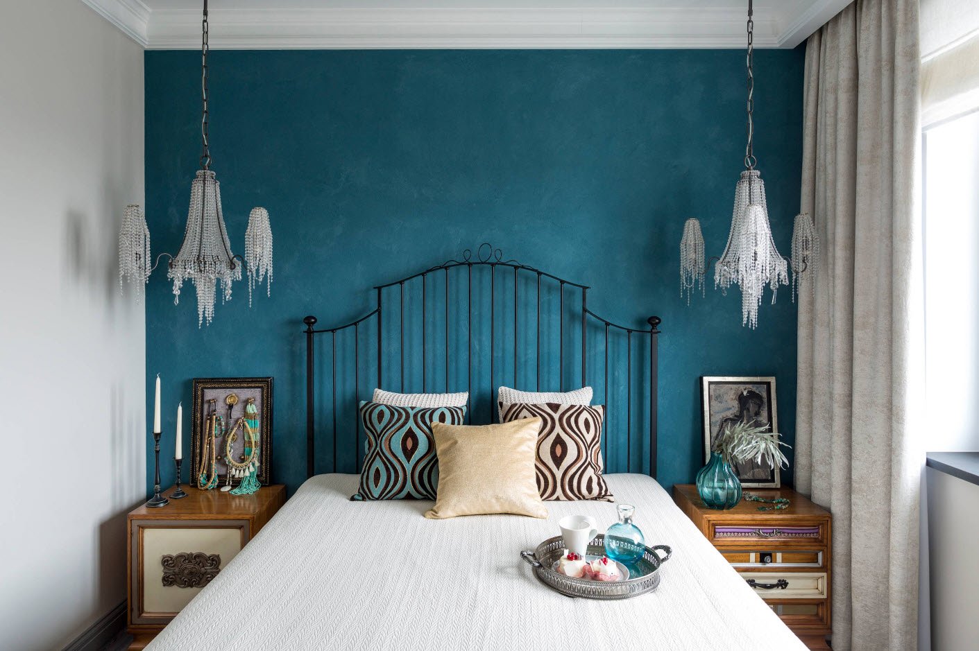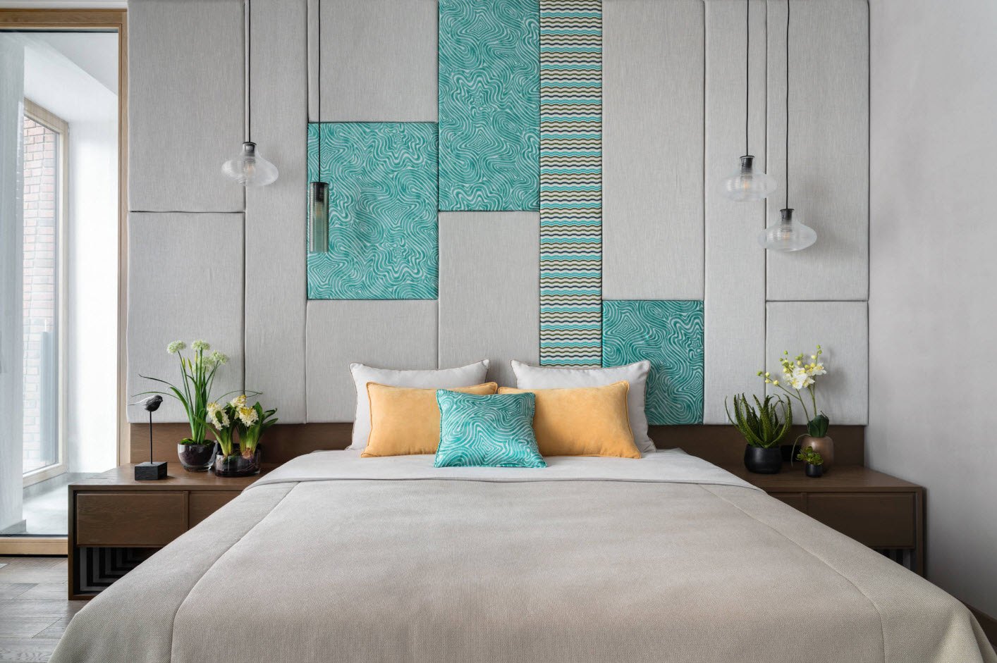 Idéal pour n'importe quel but de conception. Ici, il est recommandé de centrer le lit et de disposer le reste du mobilier pour y construire. Le design symétrique avec des tables de chevet, une armoire et un miroir est considéré comme classique.