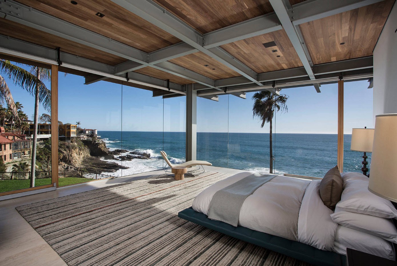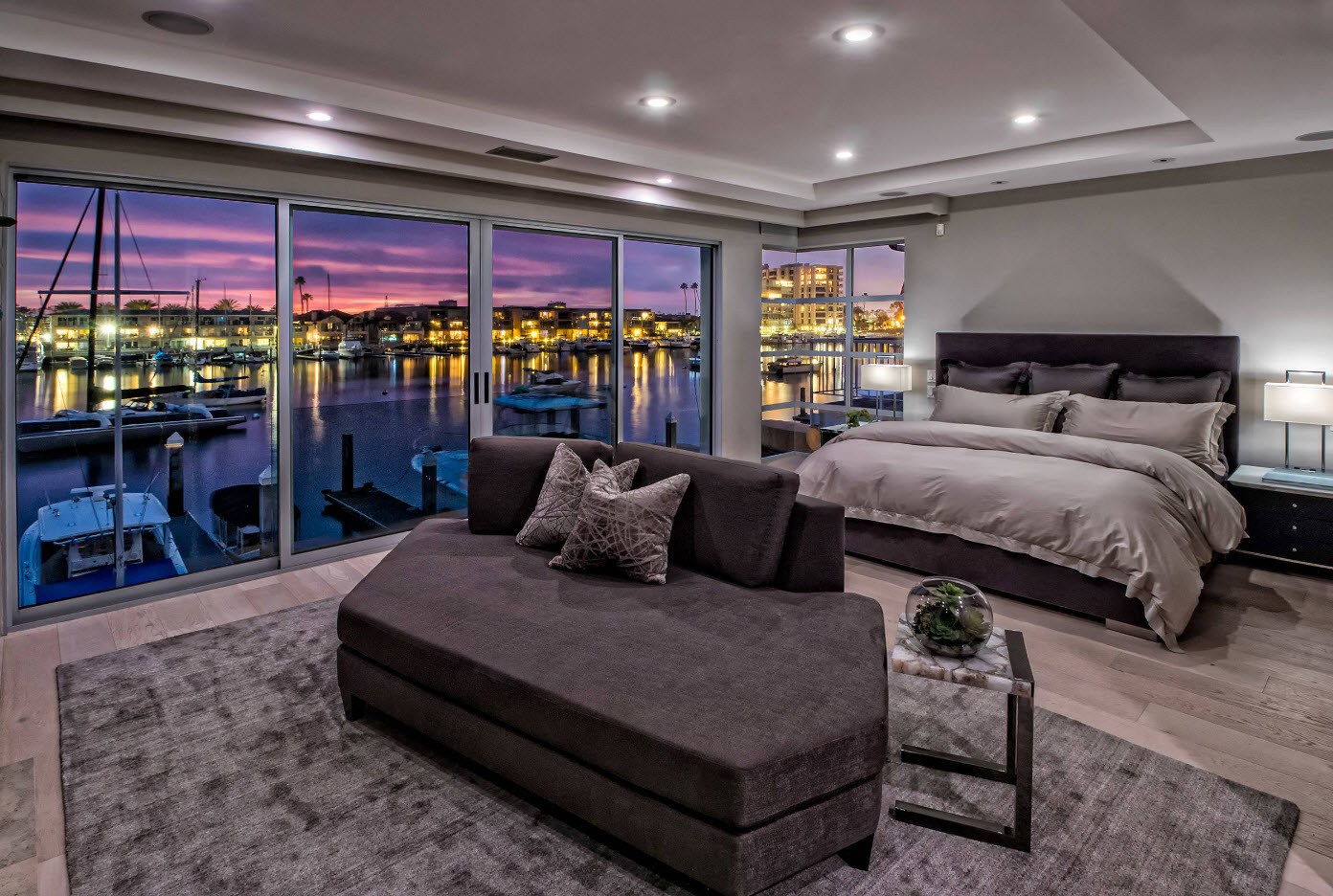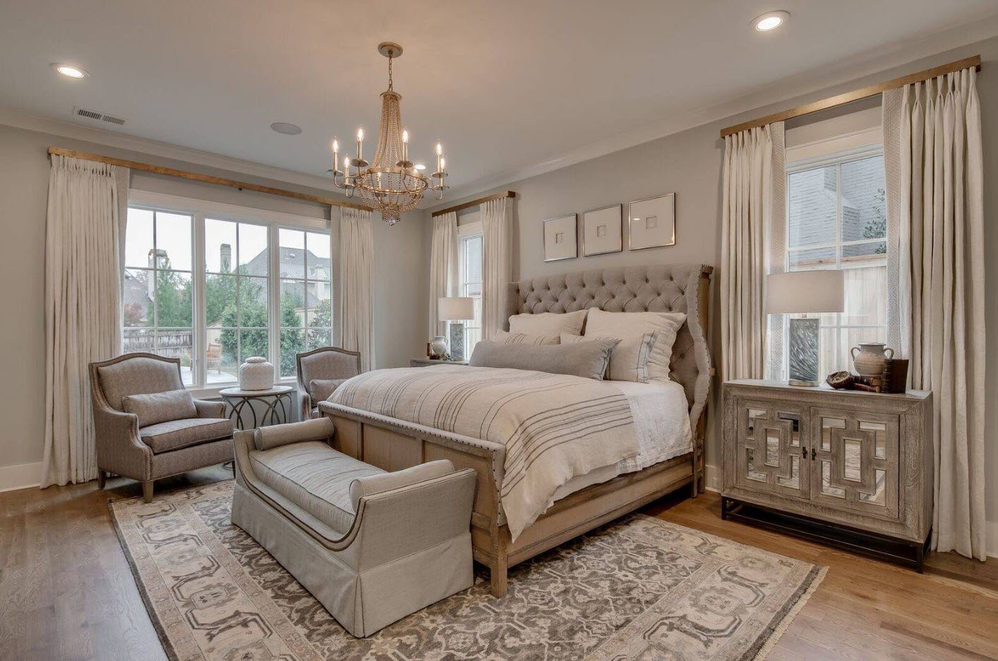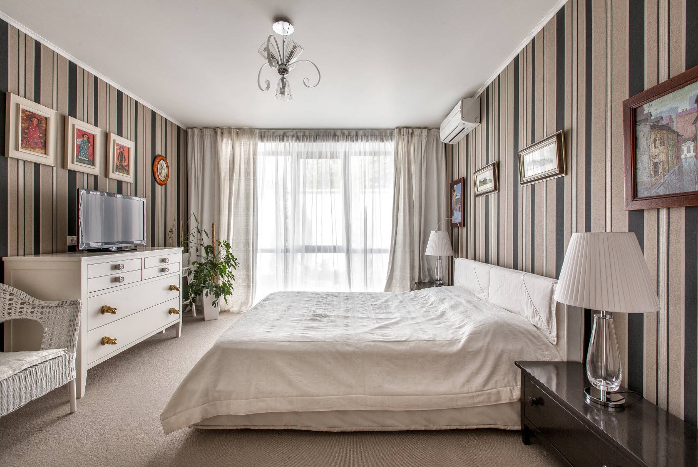 Idéal pour n'importe quel but de conception. Ici, il est recommandé de centrer le lit et de disposer le reste du mobilier pour y construire. Le design symétrique avec des tables de chevet, une armoire et un miroir est considéré comme classique.