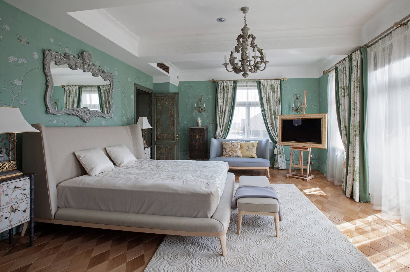 Sur une grande surface, il est facile d'équiper un intérieur classique, voire pompeux. Tout d'abord, il est important de trouver du papier peint avec des motifs luxueux dans des couleurs sombres et saturées, pour obtenir un lustre en cristal, et surtout - pour acheter un grand lit avec des pieds en bois et un auvent.