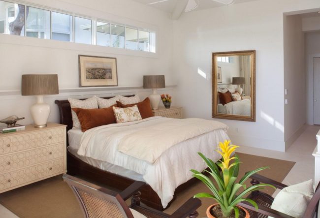 En revanche, une distance suffisante de la fenêtre peut affecter, au contraire, le manque de soleil. Pour ce faire, vous pouvez obtenir des lampes sur les tables de chevet ou des spots au plafond au-dessus du lit.