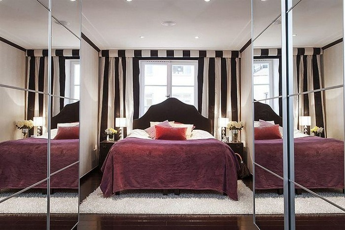 Lorsque la chambre est trop petite et que vous devez aménager un endroit pour dormir, face à la fenêtre ou à la tête de lit, vous devez choisir la deuxième option, car la lumière du soleil du matin vous frappera certainement les yeux et vous réveillera, à moins, bien sûr, de la rideau avec des rideaux très épais.