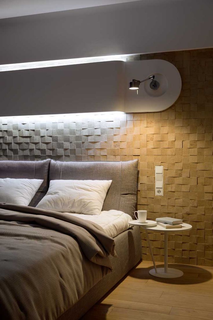 Chambre dans un style moderne avec éclairage, intégrée dans un mur de niche derrière la tête du lit