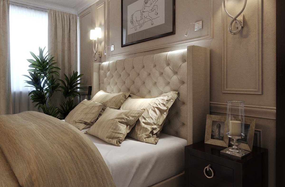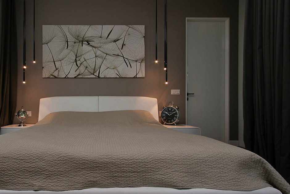Si la pièce est petite, une paire d'appareils de chevet qui donnent une faible lumière douce lui suffira. Pour une grande chambre, vous devez fournir un bon éclairage dans toute la zone. Dans ce cas, une attention particulière doit être accordée aux zones les plus sombres - coins, niches et espace près du lit. Dans ce cas, quelques veilleuses ne peuvent pas faire, vous aurez besoin d'une source d'éclairage principal. Le plus souvent, un lustre de plafond est utilisé à cet effet, dont la lumière est complétée par plusieurs appliques ou lampadaires.