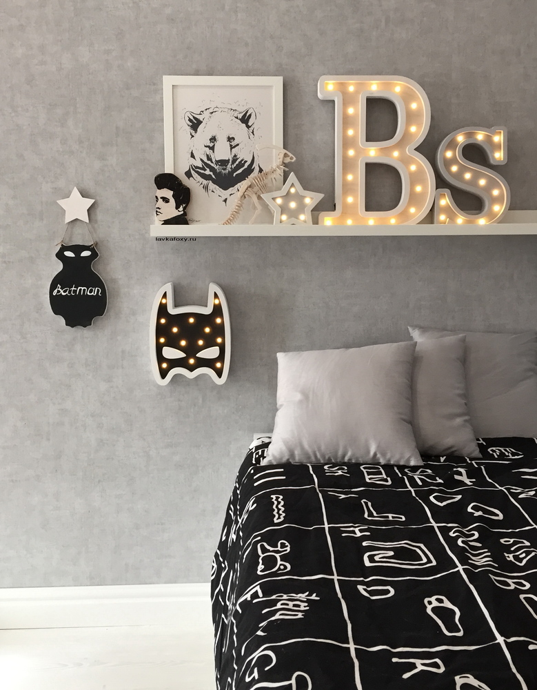 Une lampe de nuit bien choisie décore l'intérieur de la chambre et complète l'idée de design thématique.