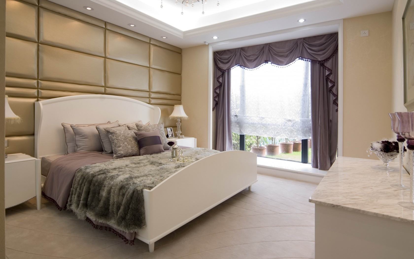 L'un des mouvements de conception les plus populaires pour une grande chambre est la décoration dans des tons clairs, parfois absolument blancs, dans une pièce avec des fenêtres panoramiques. Cette combinaison met l'accent sur la taille de la chambre, sa propreté, son élégance.