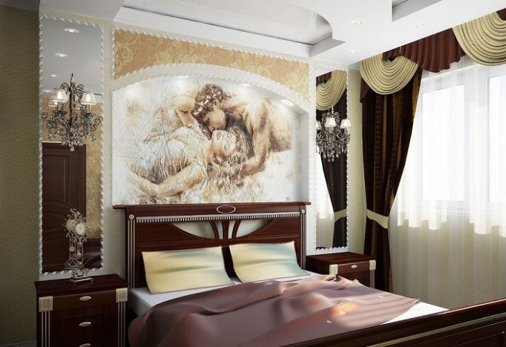 Type de décoration inhabituel et moins courant. Cependant, il a le droit d'exister. Il est un peu plus difficile de travailler avec du tissu qu'avec du papier peint et de la peinture, mais en contrepartie de la complexité, cela donnera un luxe royal à votre chambre.