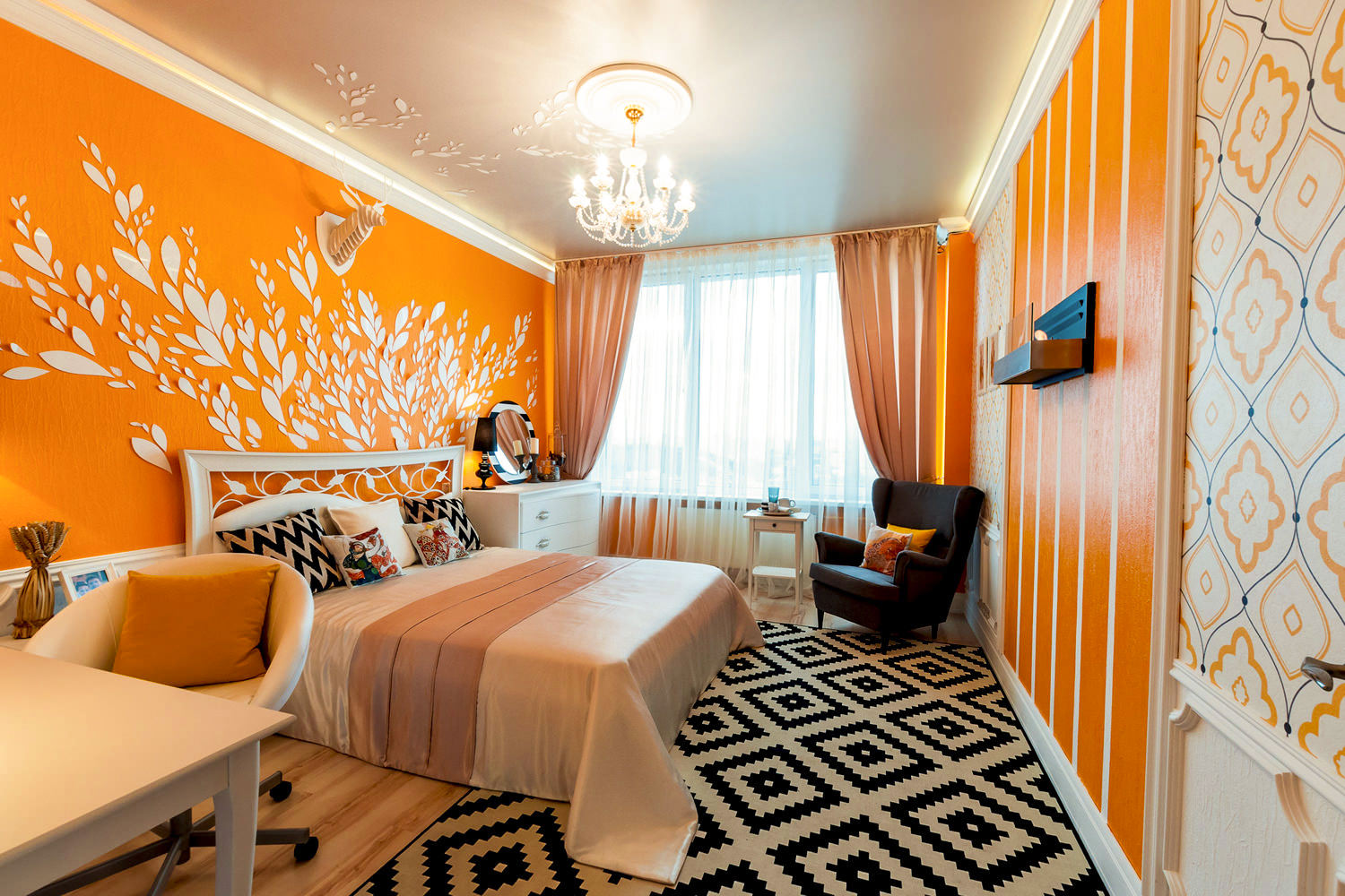 | Les concepteurs recommandent d'utiliser des couleurs calmes pour la chambre, à la fois claires et foncées. | Ainsi, le jaune, la couleur du soleil, signifie la joie, l'orange, la couleur de la vie, l'amour de la vie, le bleu, la couleur céleste, interprète la liberté. |