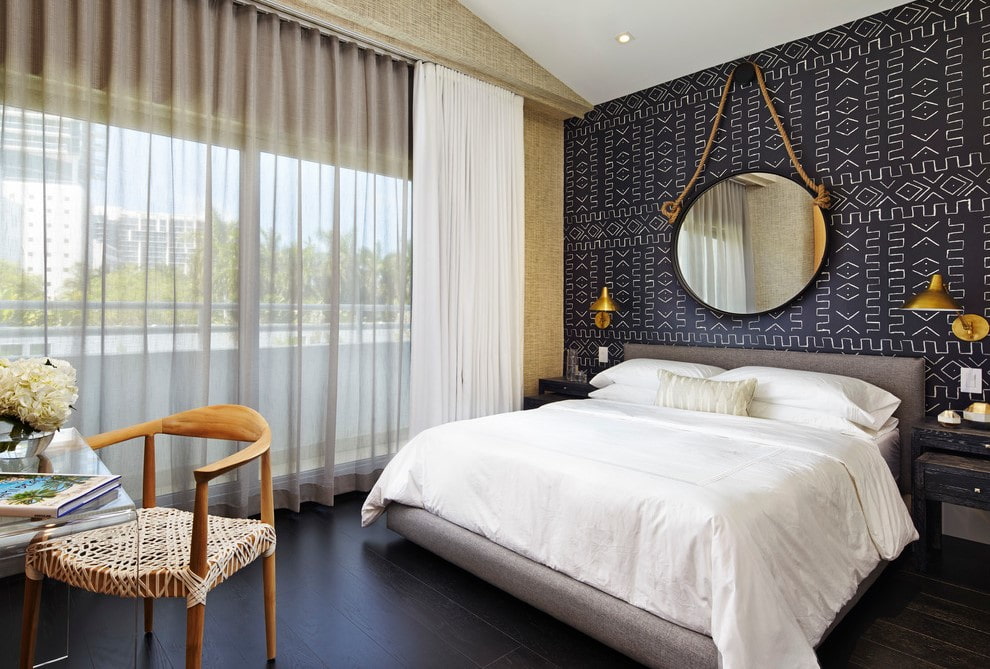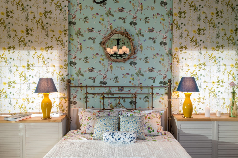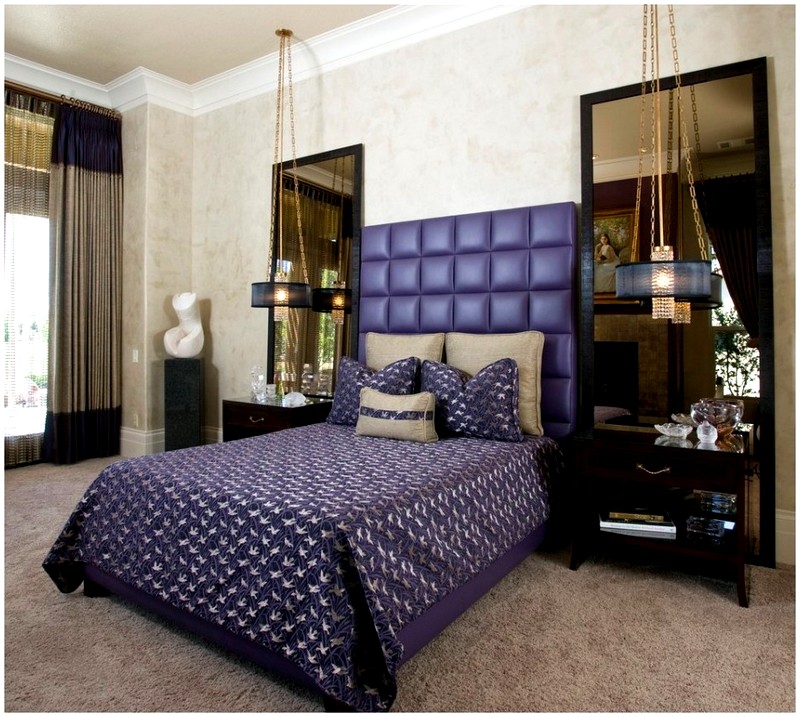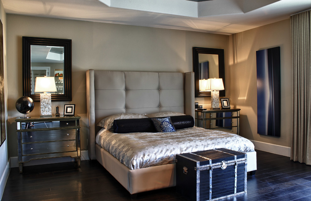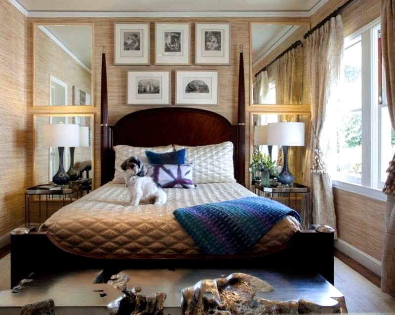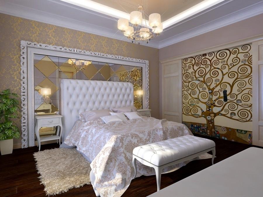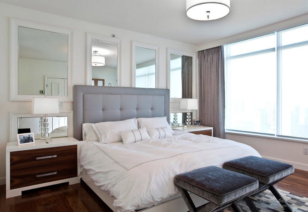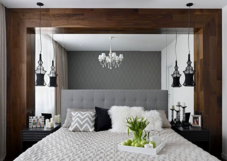 Le miroir au-dessus de la tête du lit est une technique de conception assez courante, avec laquelle vous pouvez souligner les nuances thématiques de l'intérieur