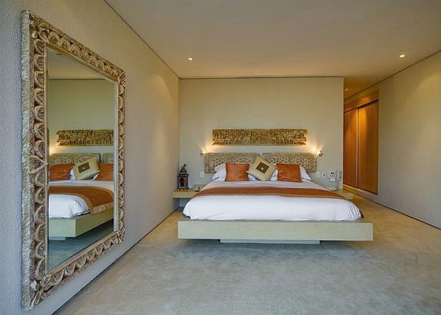 Une paire de miroirs situés sur les côtés du lit ajoute un certain mystère et mystère à l'environnement.