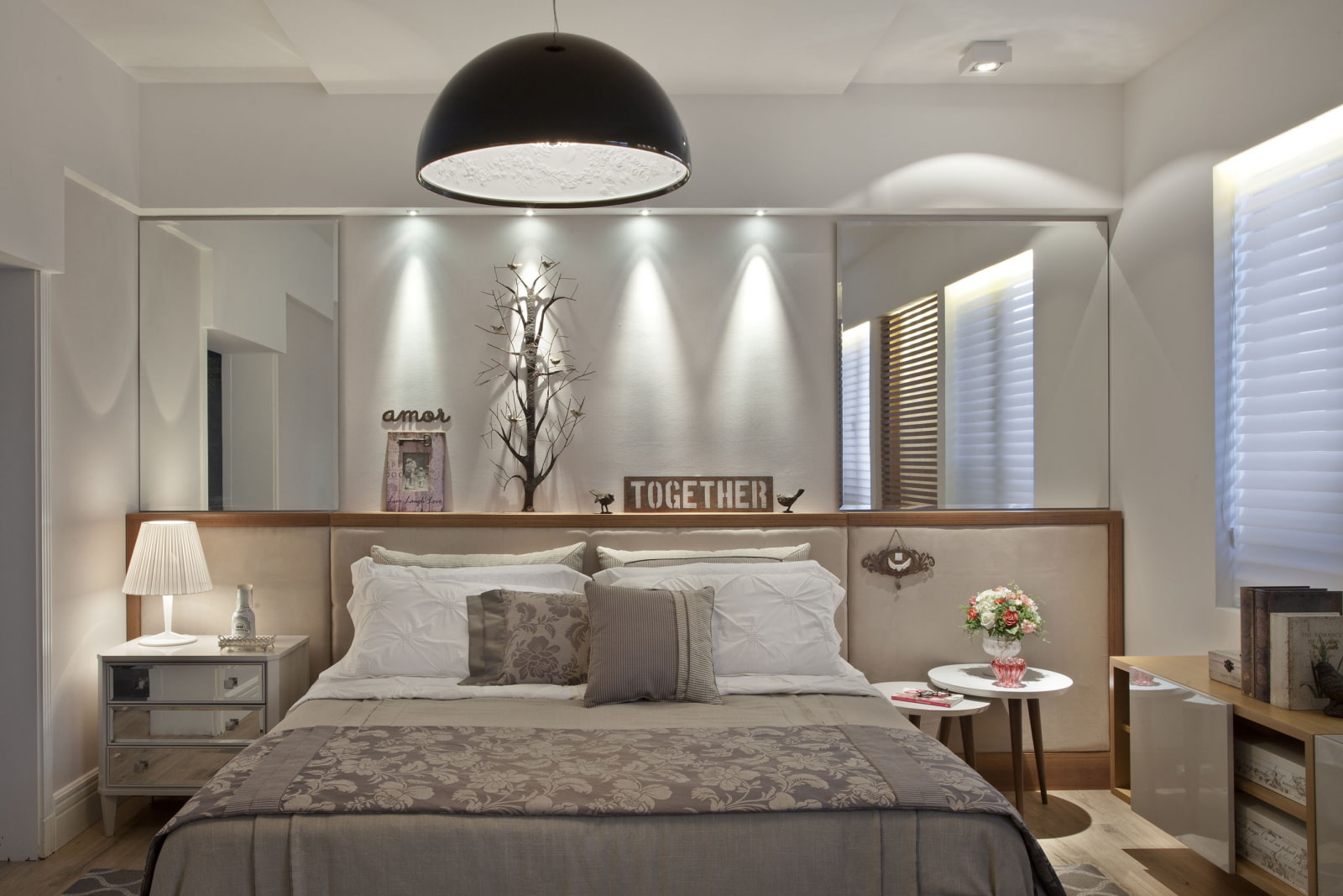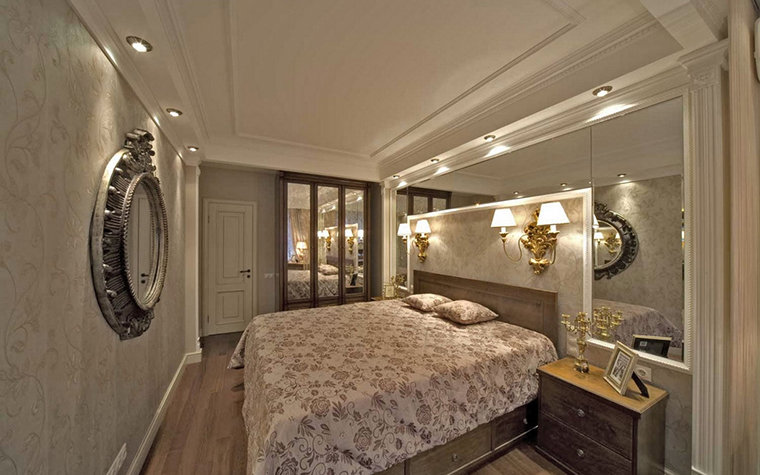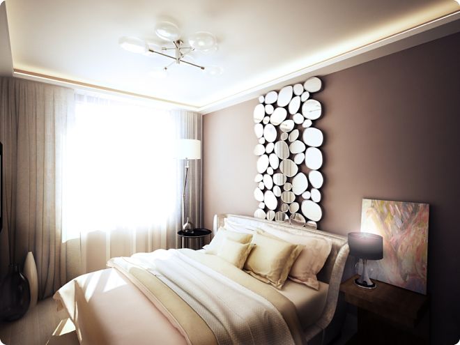 Comme alternative à l'option de placer le miroir le long du mur, il est possible de placer un miroir au-dessus du lit dans la chambre, cette conception est bien connue et utilisée depuis longtemps, en plus il est également possible d'ajouter plus «d'air» à l'espace de votre pièce.