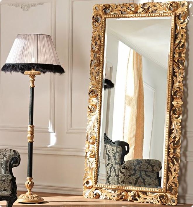 Le miroir au sol dans un cadre doré s'intègre parfaitement dans toutes les directions stylistiques