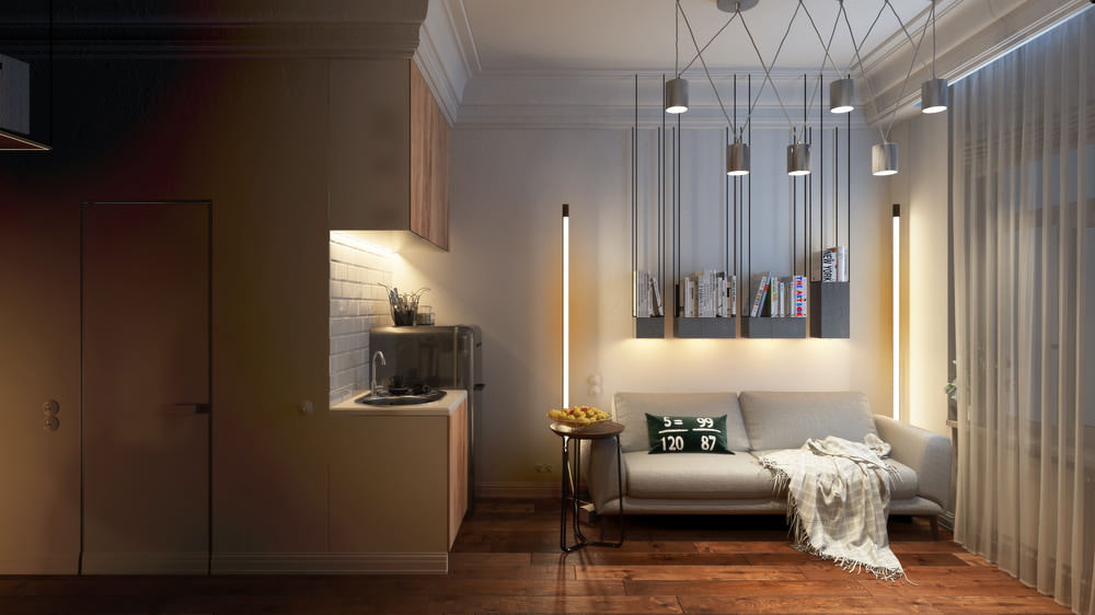 L'éclairage est mieux fait intégré dans les meubles et les murs, et ajoutez quelques lampes de plafond modernes. Pour les fenêtres, des rideaux-stores ou des stores conviennent.