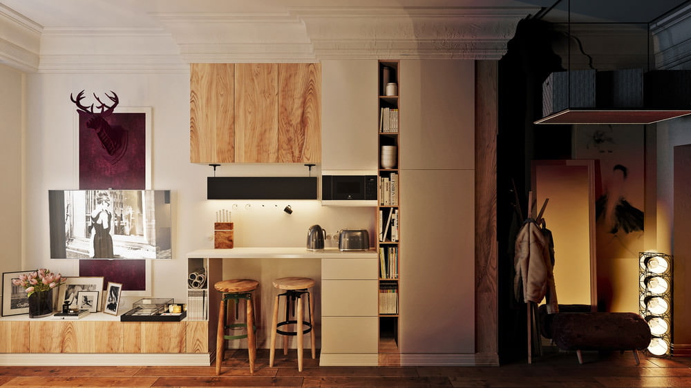 La cuisine est faite de couleurs vives, les murs avec du plâtre décoratif séparent encore plus fortement la zone du reste du studio. Le comptoir de bar avec chaises hautes fait office de cloison entre les zones, tout en restant fonctionnel. Les appareils de cuisine, les armoires murales et les étagères intégrés économisent suffisamment d'espace de cuisson.